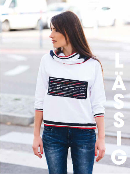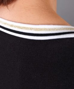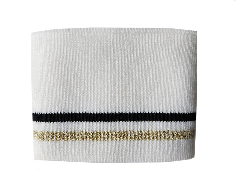 Dieses tolle Strick-Bündchen im Collegestyle mit schmalen Streifen in Schwarz und Glitzer-Gold ist ein Must-have für unzählige neue Designmöglichkeiten und grenzenlose Kreativität. Es wird einfach angenäht. Der Bündchenstoff eignet sich hervorragend für Abschlüssen an (College-)jacken, Hosen, Shirts & Pullovern. Abbildung am Halsausschnitt und Arm in schmaler Variante, am Saum in breiter Variante. Schnittmuster Damenkleid Helena und Pullover aus unserem Buch “Hoodies”.