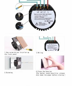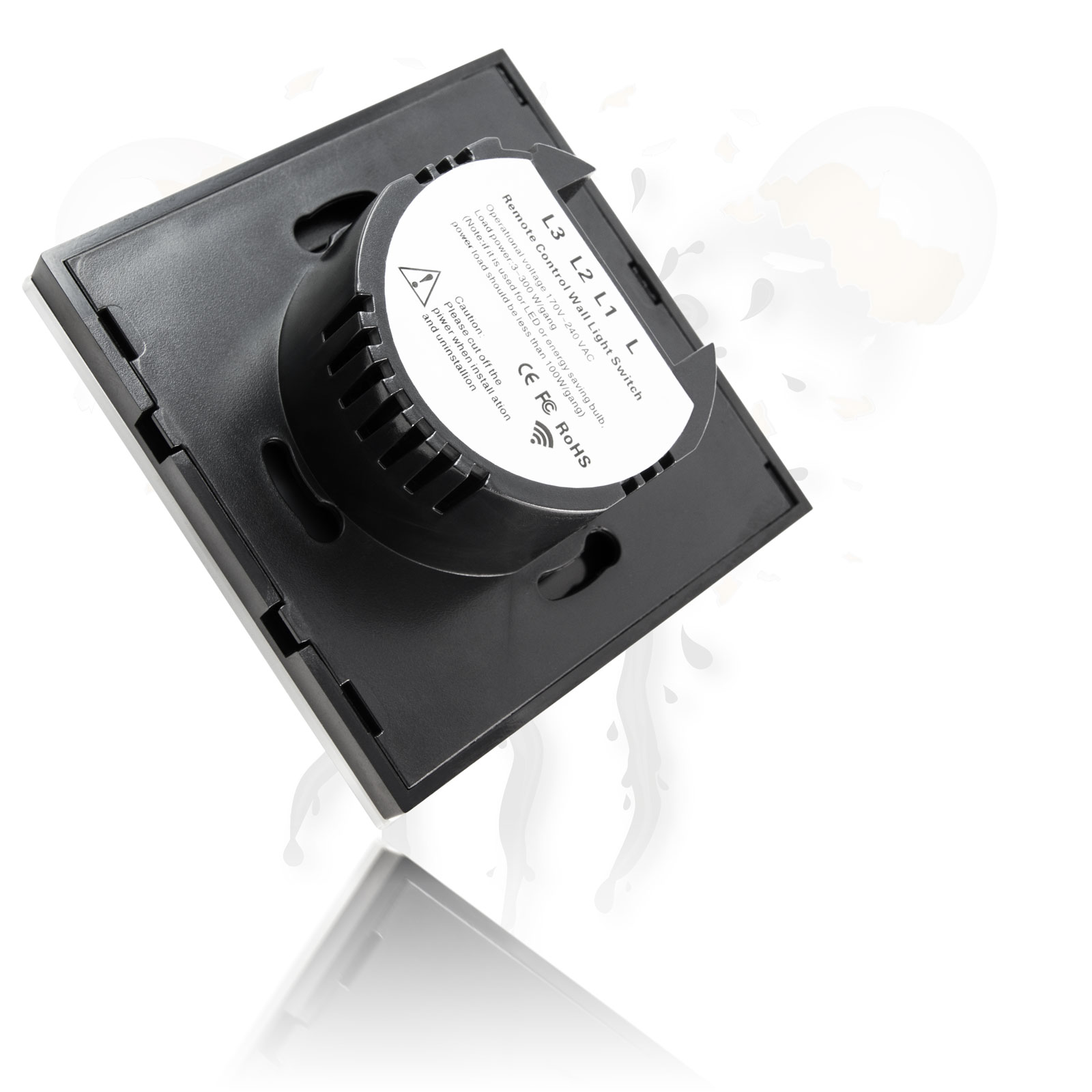 The tempered glas panel of the 433 MHz RF light switch is available in black or white. The fire resistant ABS molding is based on EU Standard. Each channel of the RF Light Switch can switch devices up to 300W.