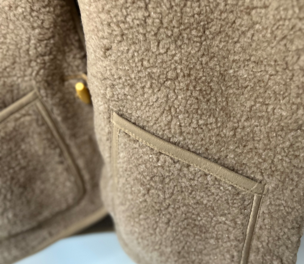 ULTRALEICHTE WOLLE   100 % Wolle in einem Fleece mit Schaffellstruktur und einer sehr leichten Formel. Der Stoff zeichnet sich durch außergewöhnliche Weichheit und Elastizität aus, wodurch er uns sanft umhüllt. Charakteristisch für dieses Material ist seine schwarze Basis, die die Farbe des verwendeten Wollvlieses intensiv zur Geltung bringt.