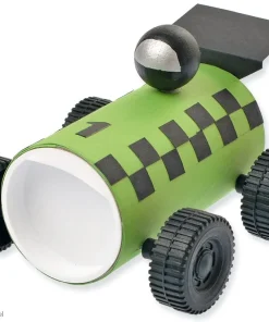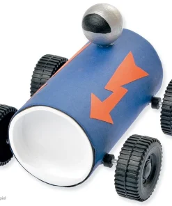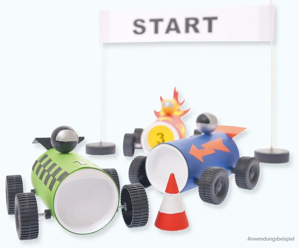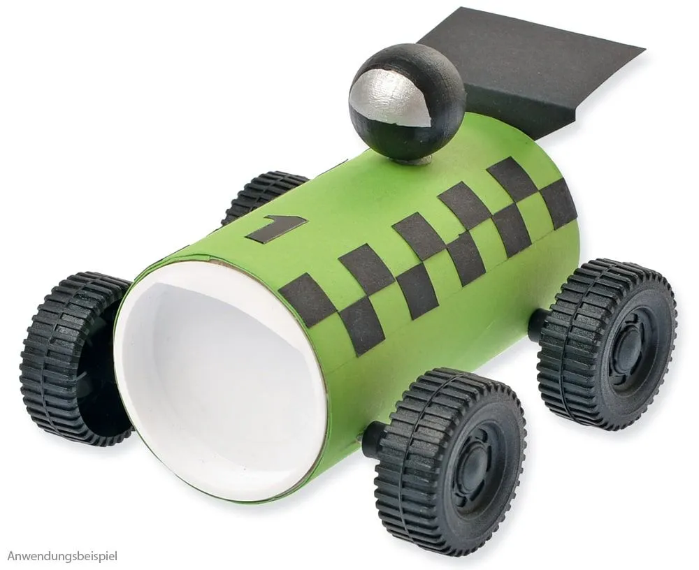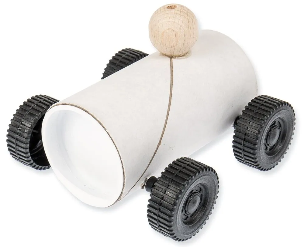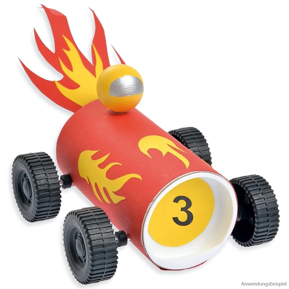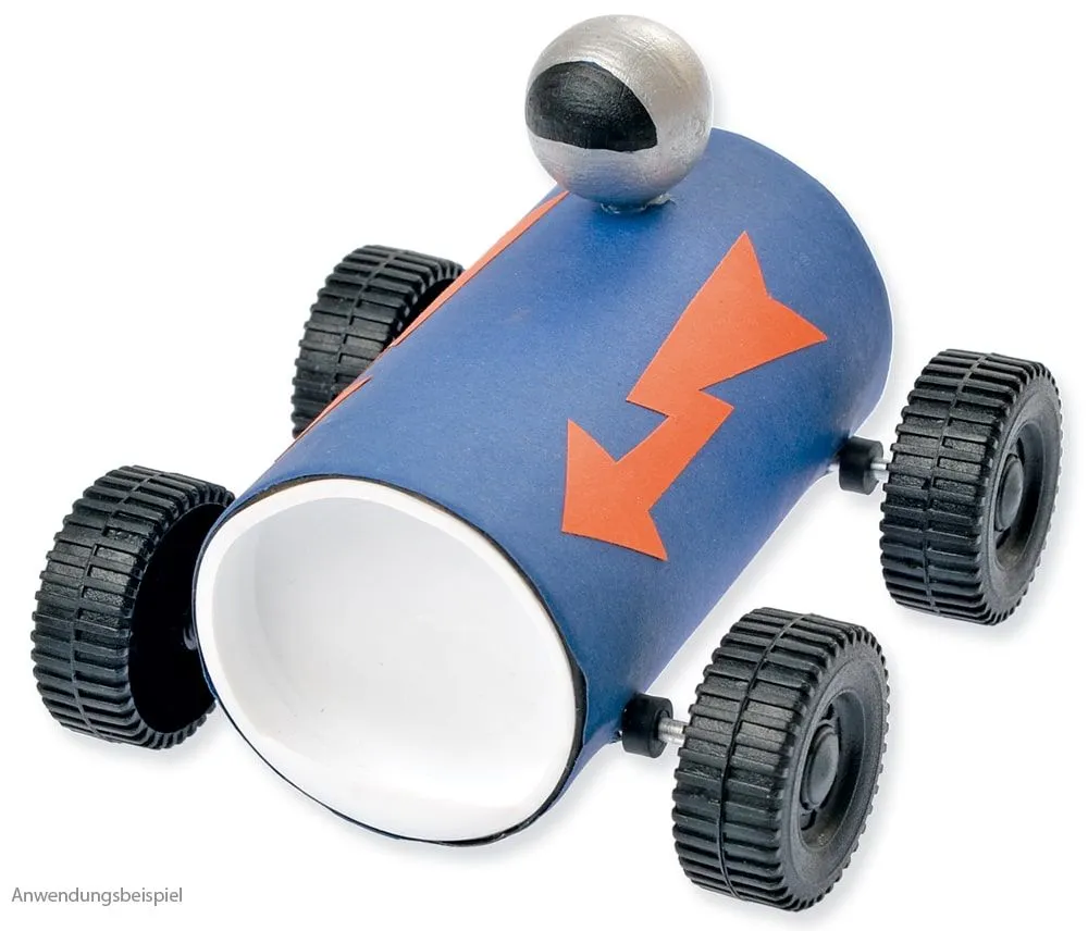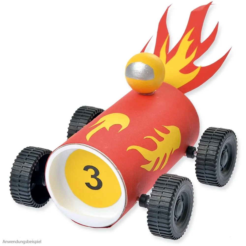 - Komplettes Materialset inkl. 1X Kartonrolle, 2x Kunststoff-Deckel, 2x Metall-Achsen, 4x Distanzringe & 4x Kunststoff-Räder, 1x Holzkugel