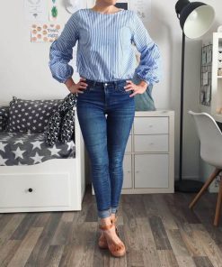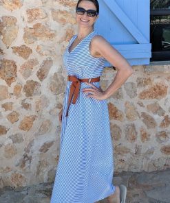 Hochwertiger, elastischer Baumwollstoff in Blau / Weiß gestreift. Ideal für leichte Blusen, Hemden, Hemdkleider, Kleider, Hosen, Lätzchen, Röcke und vieles mehr. Abbildung Schnittmuster Damenbluse Augusta und Kleid Nona in hellerer Farbstellung aber gleicher Artikel. Bei dem Kleid Hille haben wir einen “Kartoffeldruck” mit Textilfarbe aufgebracht.