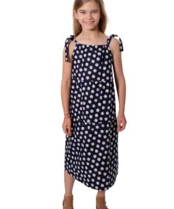Ein schöner Baumwollstoff, ideal zum Nähen von Bekleidung und Behelfsmasken. Abbildung Schnittmuster Kinderkleid Tuli in Marine mit Musterung aber in gleicher Qualität und Nasen Mund Maske mit Herzen Musterung.