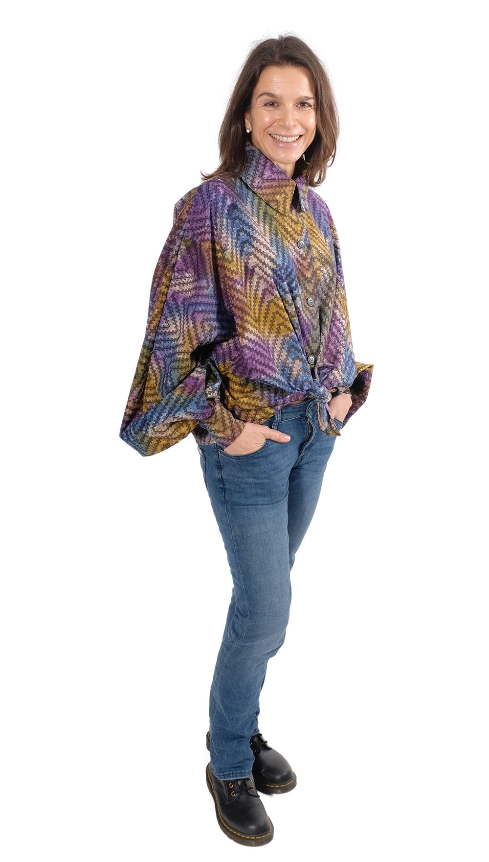 Ein wunderschöner weicher Baumwollstoff mit Batikmusterung bedruckt. Der Stoff fällt leicht und locker, ideal für Blusen, Kleider und leichte Röcke. Abbildung Schnittmuster Bluse Levinia, Ellen und Sabine und Kleid Fina andere Schnittmuster in gleicher Qualität zur Inspiration.