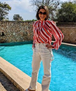 Eine Bluse welche ehrlich gesagt nicht so einfach zu nähen ist, aber wenn sie fertig ist wirst Du es sicher nicht bereuen sie genäht zu haben. Die Bluse besticht vorne durch die gedrehte Optik, hinten im Nacken wird sie dann mit einer Schleife gebunden. Die Bluse ist ein wirklicher Hingucker und ein Fashion Highlight. Andrea von @andelinde hat sich die Bluse verlängert und ein Kleid daraus gezaubert, auch das finden wir eine tolle Idee!