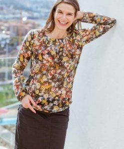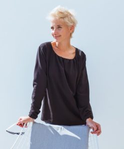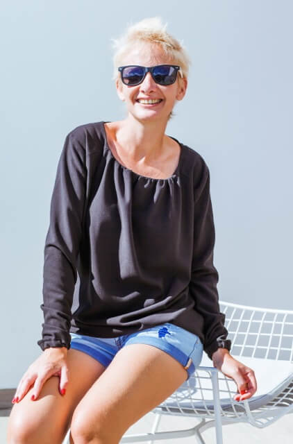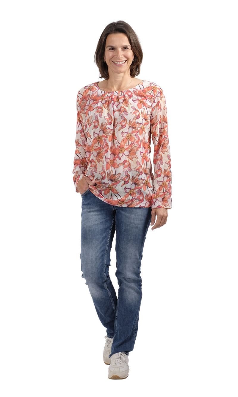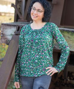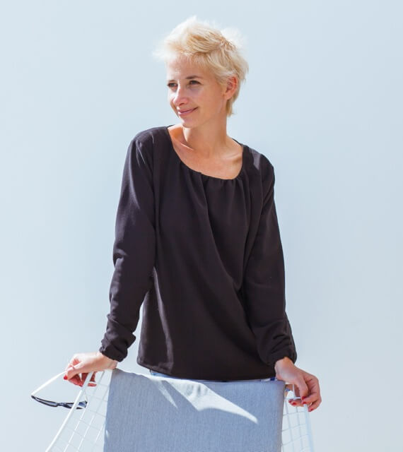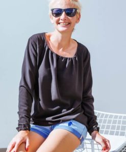 Diese Bluse oder Tunika kannst Du aus verschiedenen Stoffen und in verschiedenen Varianten nähen. Ob mit Falten oder eingesmokt, mit geraden Armen oder eingekräuselt, sie wird immer wieder anders aussehen. Die Stoffe können stabil sein, sollten aber alle “weich fallen” – das ist sehr wichtig für den Sitz der Bluse. Bei steifen Stoffen wird sie nämlich nicht so schön aussehen. Anfänger sollten eher dünnere Baumwollbatiststoffe verwenden, Fortgeschrittene können auch Jerseystoffe, Viskosestoffe, Musseline oder Georgette Stoffe nehmen.