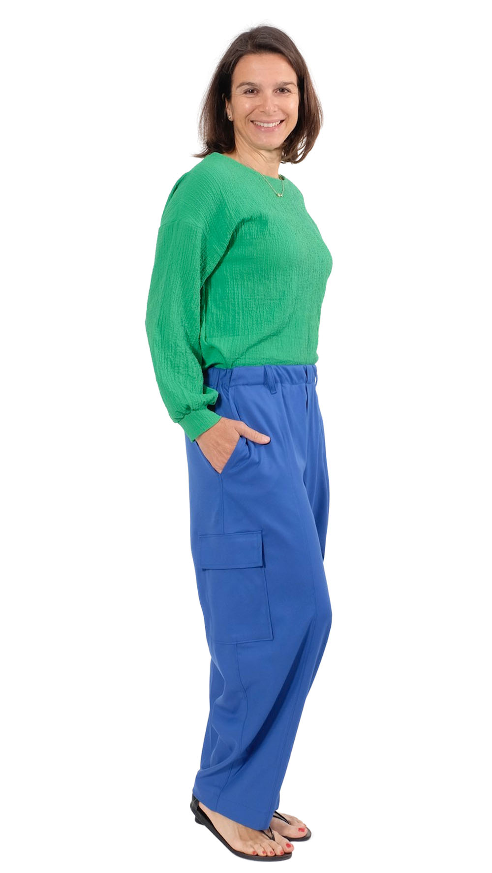 Stoffempfehlung für diesen Style: Alle weich fallenden Stoffe können vernäht werden. Wir empfehlen hier fließende Hosenstoffe, Musselinstoffe, leichte Denimstoffe, Mischgewebe. Je nach Stoff und Stand wird die Hose immer wieder einen anderen Look bekommen.