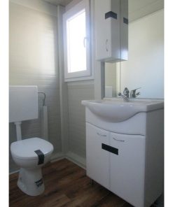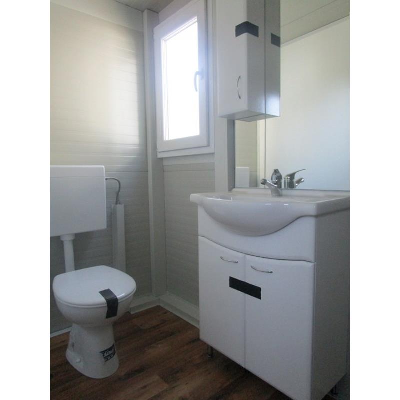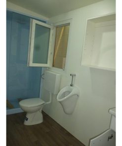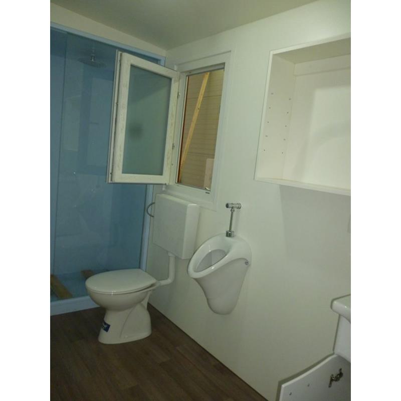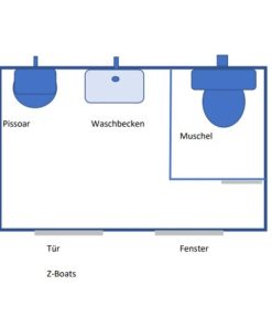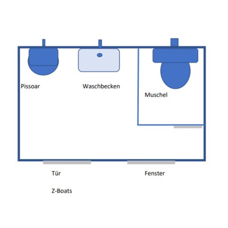 Dieses Container-System ist bereits mit Trennwand, Pissoir, WC mit Spülkasten, und Waschbecken ausgestattet. Die Anschlüsse ragen dabei im hinteren Bereich nach außen. Sie können uns auch zusätzliche Ausstattung, oder Raumaufteilung bekannt geben.