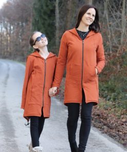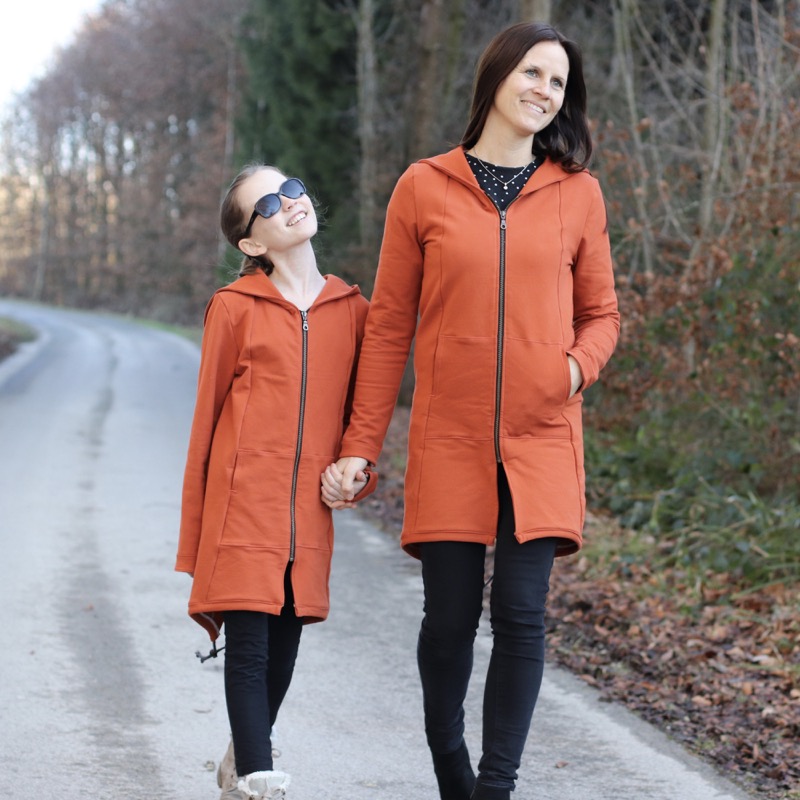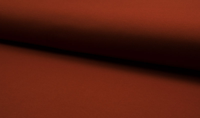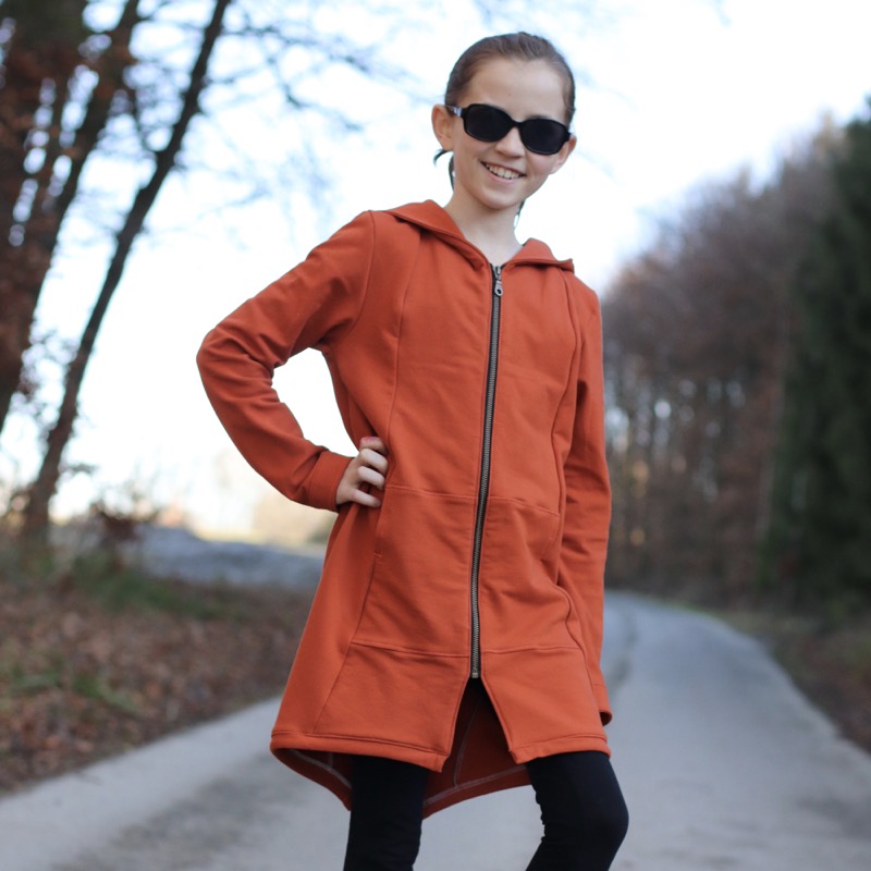 Ein hochwertiger French Terry Stoff aus Baumwolle/Elasthan in einem dunklen Rost Ton, Terra genannt. Kleider, Shirts, Hosen, Mützen und vieles mehr lassen sich hier wunderbar daraus nähen. Die Innenseite ist angeraut und kuschelig weich! Abbildung Schnittmuster Jacke Almuth in Rost. Der Farbton Terra ist noch eine Nuance dunkler!