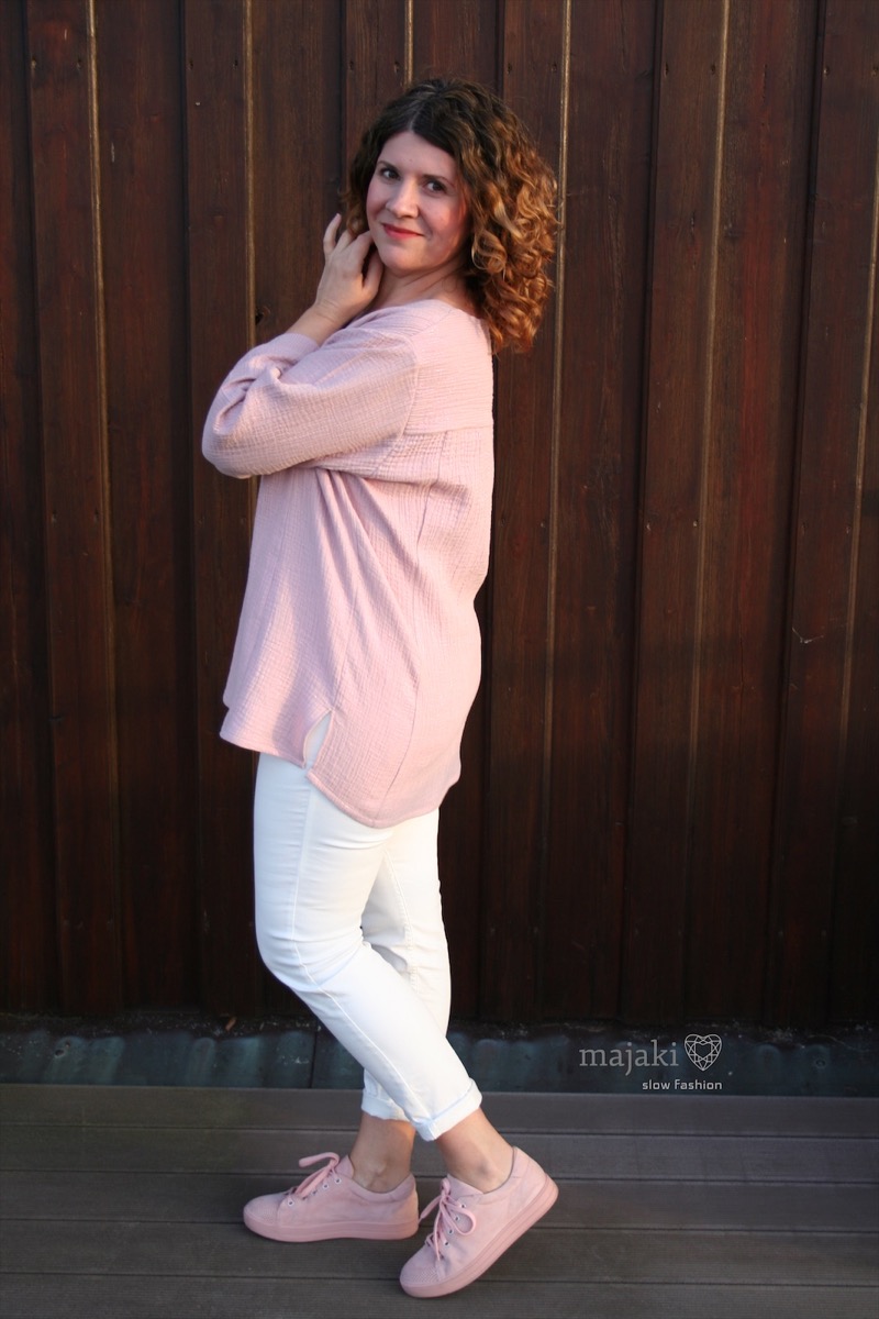 Material: 100% Baumwolle. Sehr leicht fallend, nicht mit einer typischen Gauze zu vergleichen.