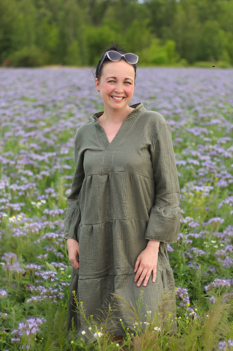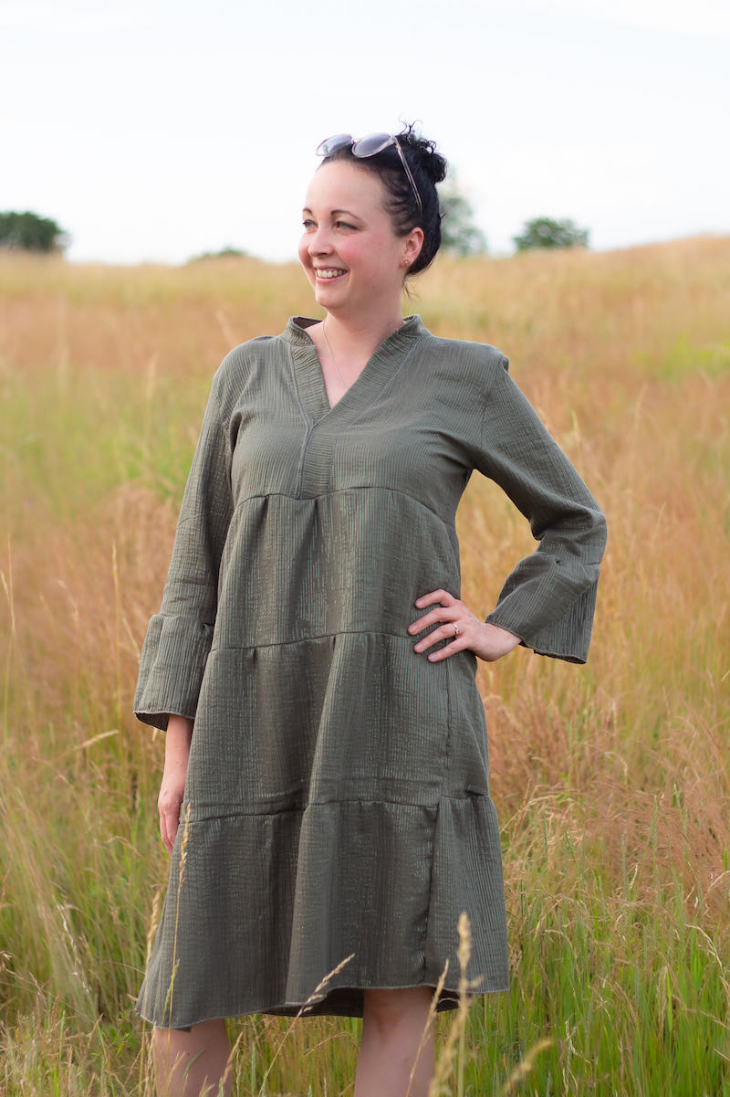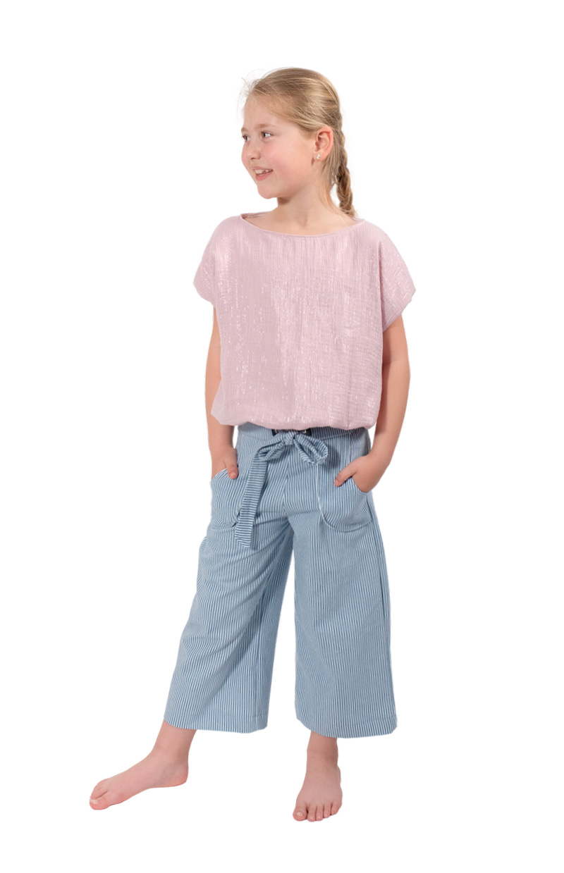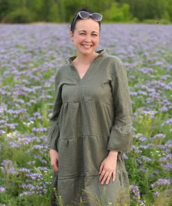 Dieser weiche double Gauze Stoff eignet sich wunderbar für leichte Sommerbekleidung wie z.B. Röcke, Hosen, Tunika und vieles mehr. Die Ware ist unelastisch, aber anschmiegsam und weich. Der eingewebte Faden ist weich und angenehm auf der Haut zu tragen. Ein Stoff mit hohem Tragekomfort und dem Vorteil, dass der “Knitterlook” das Bügeln erspart 🙂 Abbildung Schnittmuster Bluse Kirsten im Original Stoff und Shirt Erin für Kinder. Francesca in Grün.