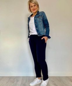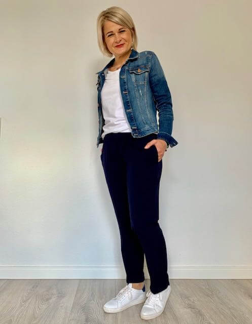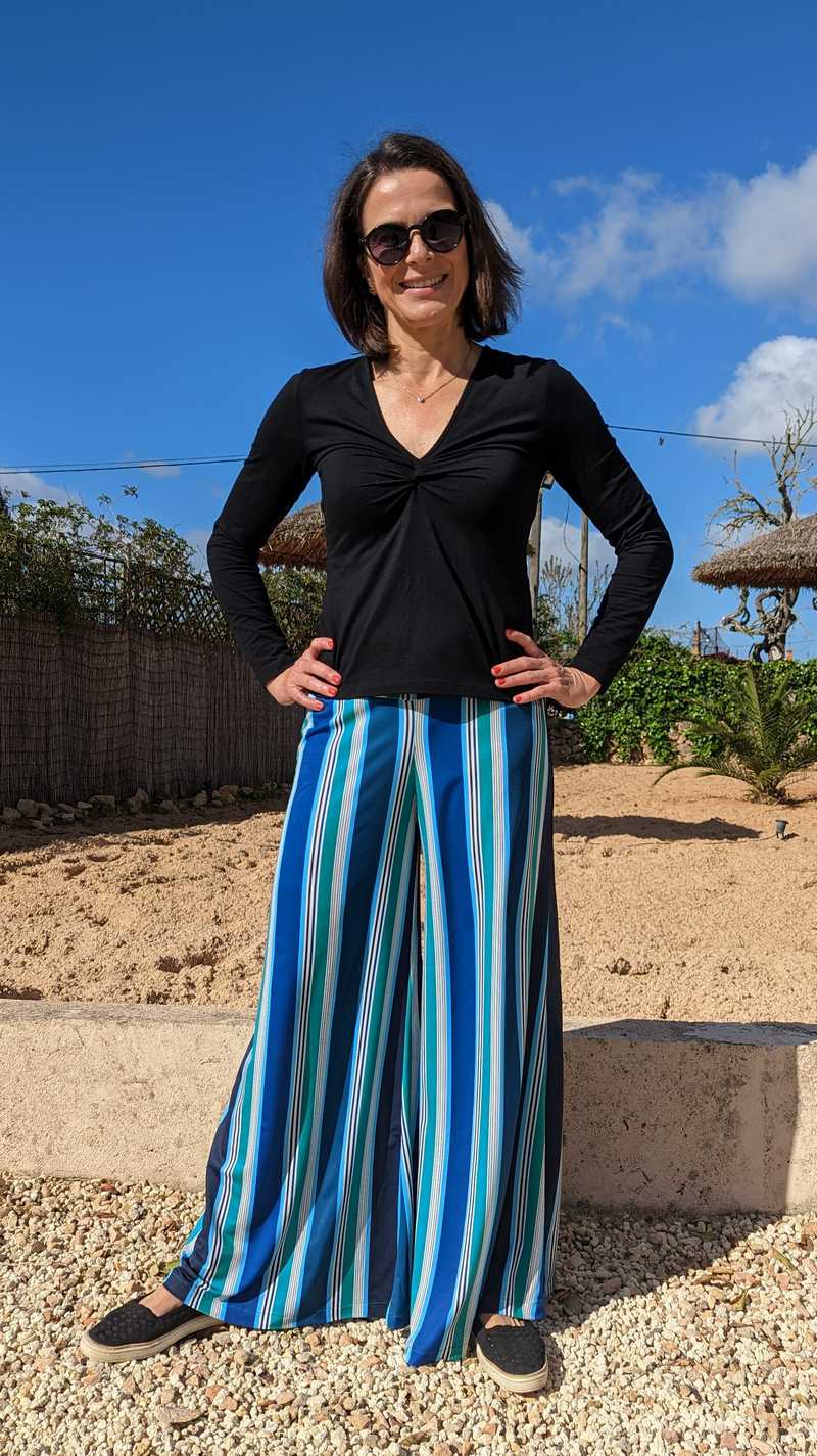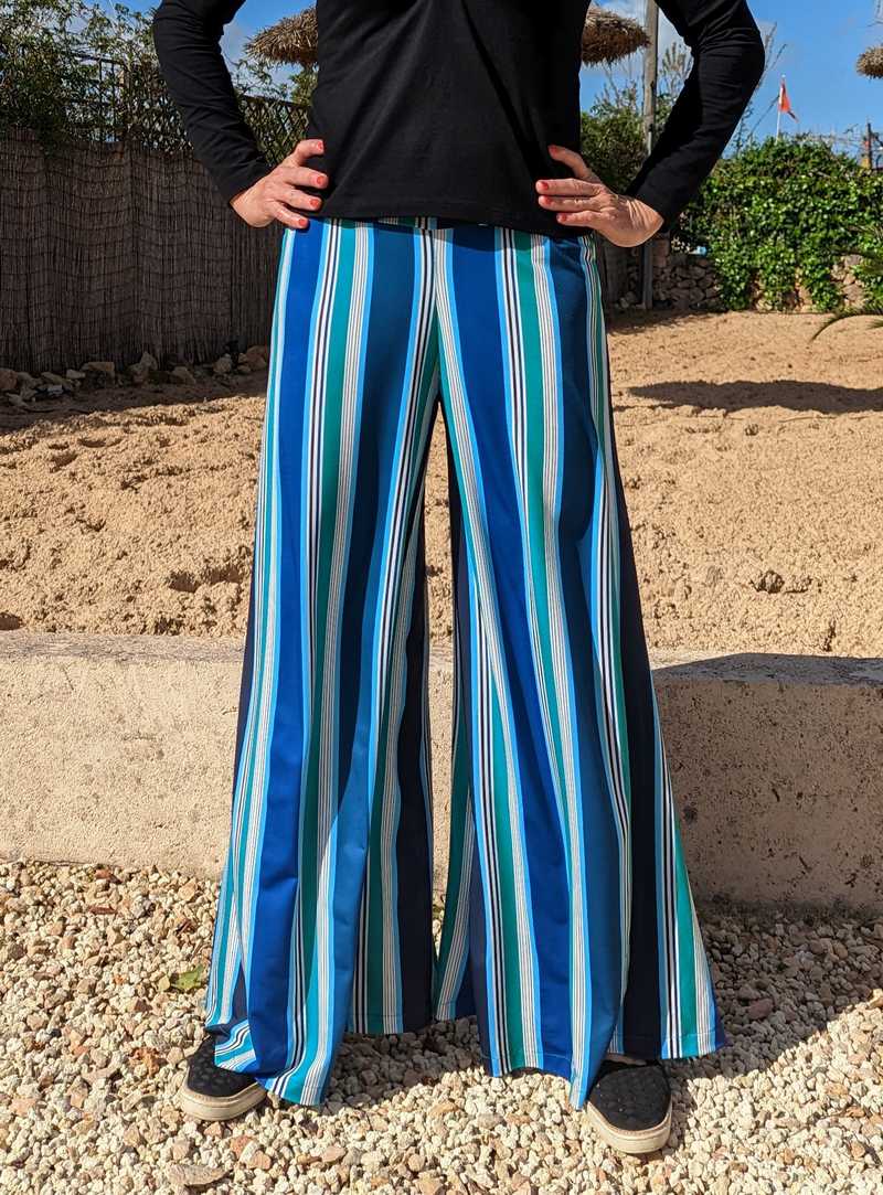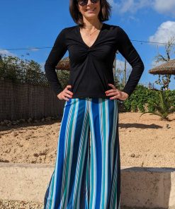 Die Slinky Ware ist durch den hohen Elasthan Anteil extrem dehnbar. Man kann ihn auch mit einem festeren Viskosejersey vergleichen. Den Stoff kann man ideal für enge Sportbekleidung aber ebenso für weitere Hosen, Wasserfallshirts, weich fallende Kleider und Röcke verwenden. Der Artikel ist bi-elastisch. Abbildung Hose Anya mit Shirt Adina in blauer Farbstellung. Abbildung Shirt Nike, Hose Willi und Legging Wiebke in anderer Musterung aber gleicher Qualität zur besseren Darstellung. Auch für unseren Jumpsuit Hazel oder die Palazzo Hose Anya bzw. Isabell ist die Ware sehr gut geeignet. Das Kleid Aida und Mariola haben wir auch schon daraus vernäht.