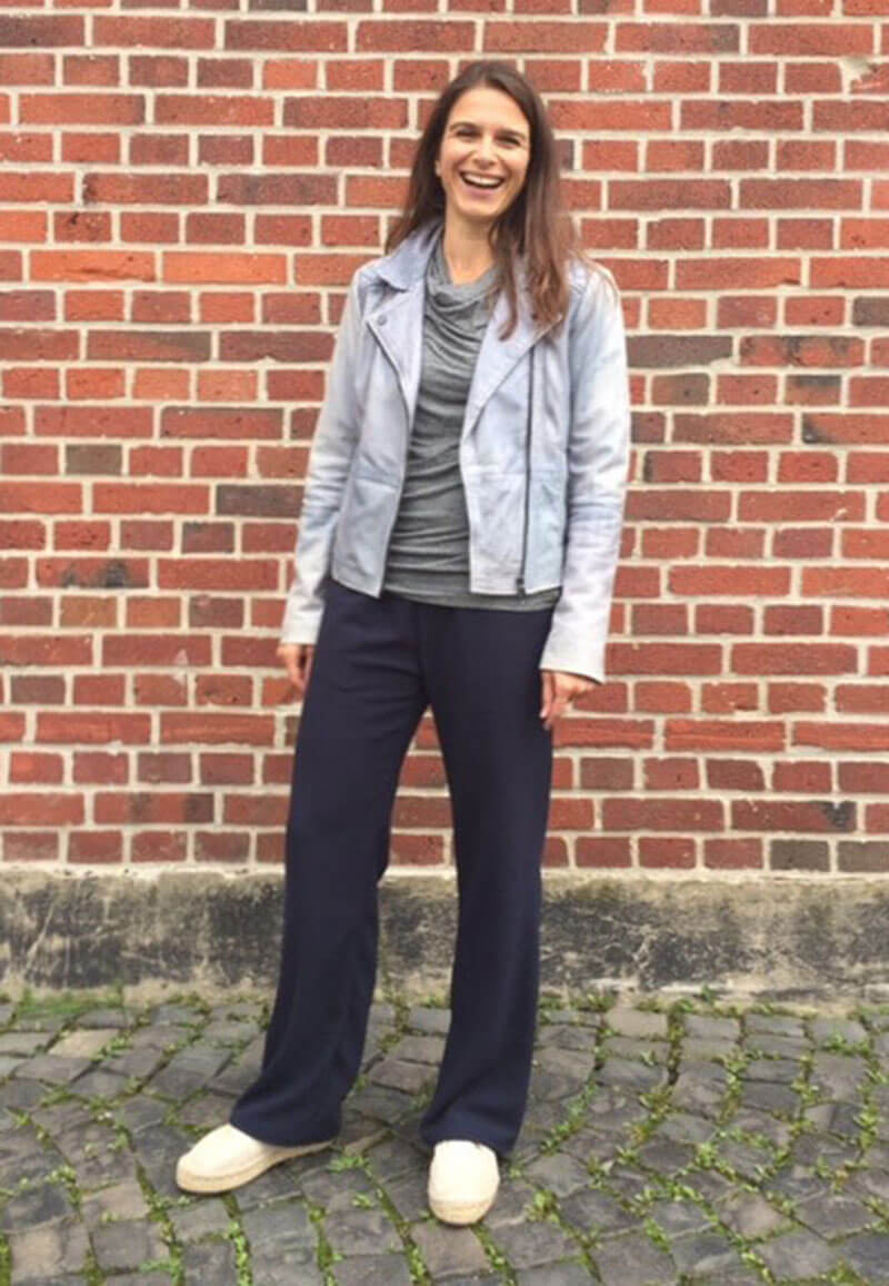 Du bist eine blutige Nähanfängerin und möchtest eine legere und bequeme Hose zaubern? Mit oder ohne seitliche Taschen, aus Jersey oder aus Viskose genäht, dieses Modell ist vielseitig und schaut immer gut aus. Je nach Stoffwahl wird die Hose auch immer wieder einen anderen Look haben. Trau Dich ran, mit unseren Videos als Unterstützung ist das ein tolles Anfängerprojekt. (Anfänger können die seitlichen Taschen im ersten Schritt einmal an einem Teststück üben oder auch komplett weglassen.)