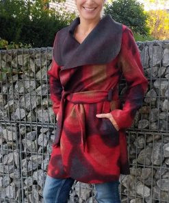 Diese einfach geschnittene Jacke / dieser Mantel “Lya” ist ein unkompliziertes Modell. Die Jacke wird nämlich nur mit einem Gürtel gebunden, somit sind keine Knöpfe erforderlich. Die Jacke kann auch offen getragen werden. Je nach Stoff ist die Jacke auch schön für “Indoor” geeignet. Für den “Outdoor Look” gefällt es uns sehr gut, wenn noch ein passender Schal mit dazu kombiniert wird. Blutige Anfänger können sich hier auch rantrauen. Das entscheidende Kriterium sind hier die Stoffauswahl und ein sauberer Zuschnitt, da die Kanten offen geschnitten, d.h. unverarbeitet bleiben. Mit einem Cutter geht das am besten. Im Schnittmuster sind 2 verschiedene Kragenvarianten enthalten, so wird die Jacke immer wieder anders aussehen.