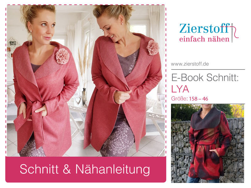Diese einfach geschnittene Jacke / dieser Mantel “Lya” ist ein unkompliziertes Modell. Die Jacke wird nämlich nur mit einem Gürtel gebunden, somit sind keine Knöpfe erforderlich. Die Jacke kann auch offen getragen werden. Je nach Stoff ist die Jacke auch schön für “Indoor” geeignet. Für den “Outdoor Look” gefällt es uns sehr gut, wenn noch ein passender Schal mit dazu kombiniert wird. Blutige Anfänger können sich hier auch rantrauen. Das entscheidende Kriterium sind hier die Stoffauswahl und ein sauberer Zuschnitt, da die Kanten offen geschnitten, d.h. unverarbeitet bleiben. Mit einem Cutter geht das am besten. Im Schnittmuster sind 2 verschiedene Kragenvarianten enthalten, so wird die Jacke immer wieder anders aussehen.