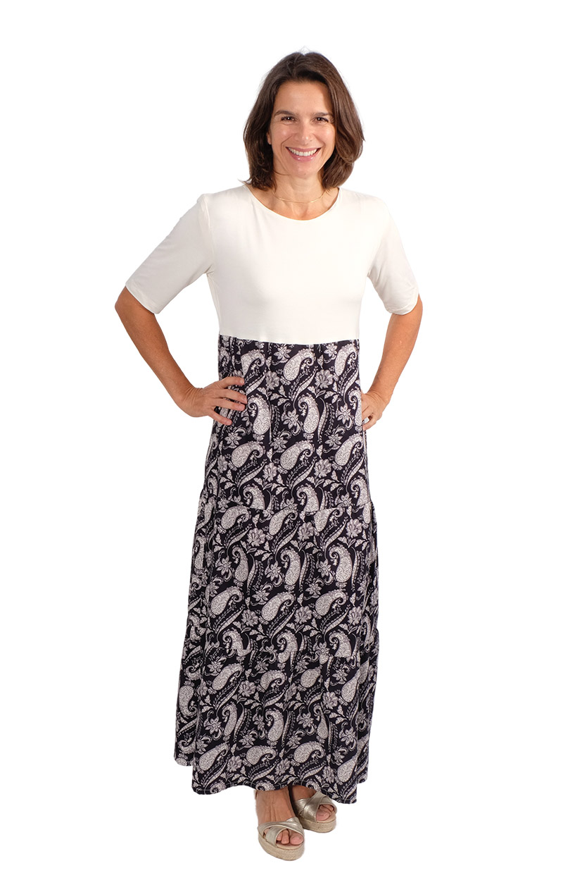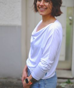 Ein hochwertiger Single-Jersey aus Bambus/Elasthan in Ecru. Der Jersey eignet sich ideal für Kleider, Shirts, Hosen, Beanie Mützen, Loopschals, Pumphosen und Jogginghosen. Der Jersey ist vom Fall und Griff her mit einem Viskosejersey zu vergleichen. Er trägt sich angenehm auf der Haut. Abbildung Schnittmuster Kleid Hera in Ecru. Shirt Hilda, Strandkleid Sandy, Wasserfallshirt Kat, Haremshose Naomi, Shirt Senta, Kleid Maresa in anderen Farbstellungen. Abbildung Shirt Sue in Weiß.