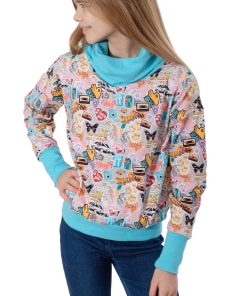 Ein hochwertiger Jersey mit verschiedene Stickern bedruckt. Das Material ist ideal für Kleider und Oberteile und vieles mehr. Abbildung Schnittmuster Rollkragen Shirt Dakota.