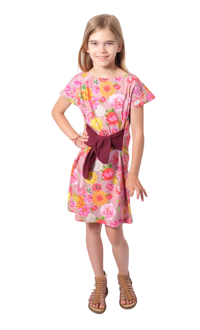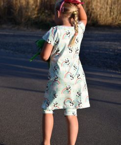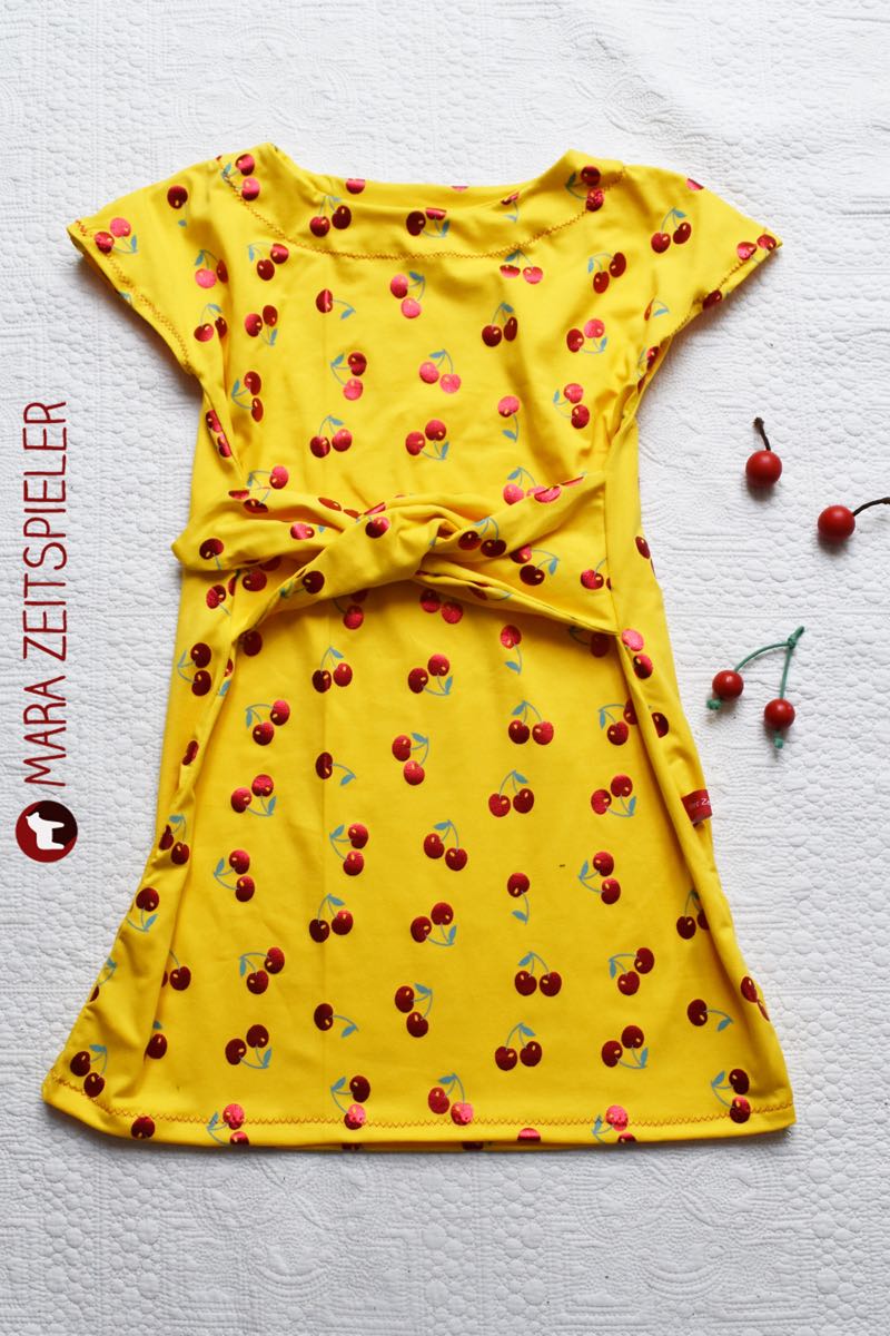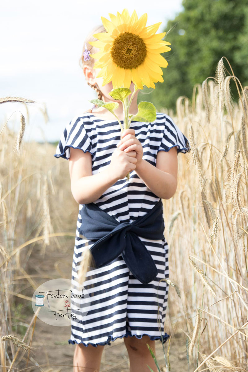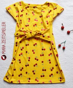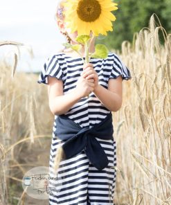 Dieses hübsche Kleid wird je nach Stoffauswahl immer wieder anders aussehen. Mit einem Shirt darunter ist es auch ganzjahrestauglich… Wer möchte kann die Schleife auch nach hinten binden, das ist problemlos möglich. Das Kleid ist auch für blutige Nähanfänger geeignet.