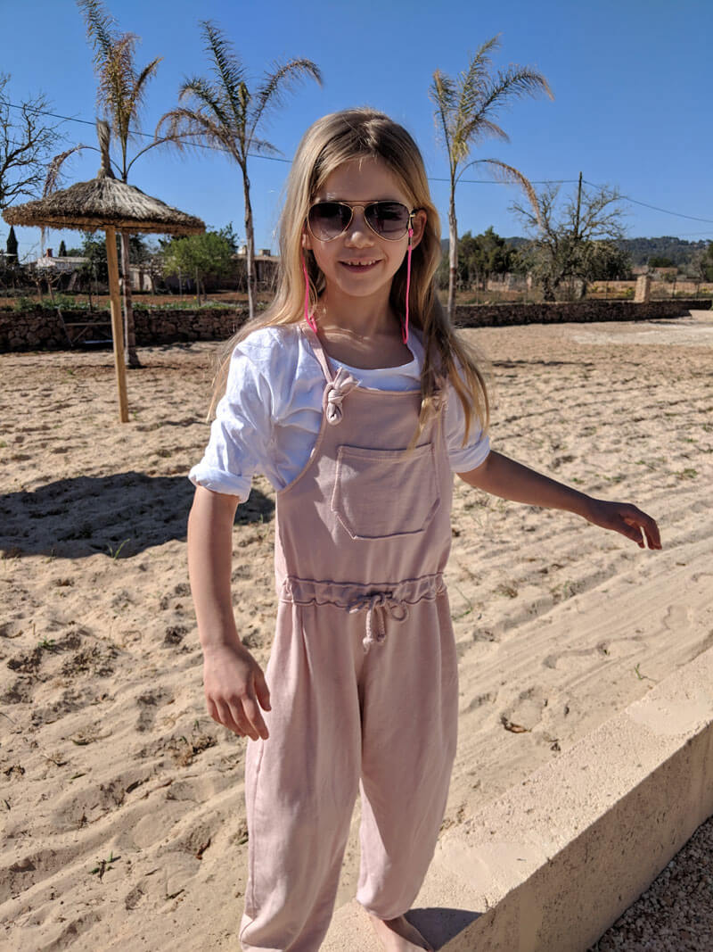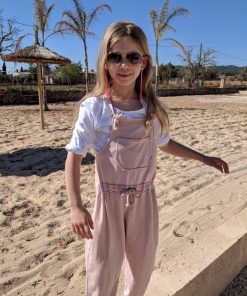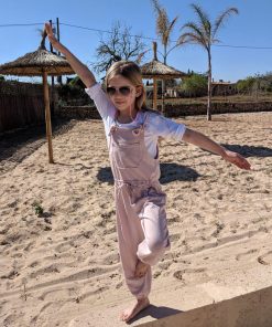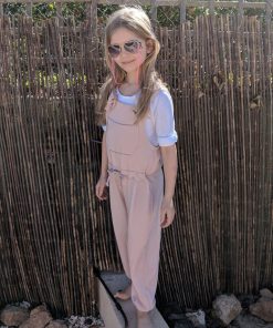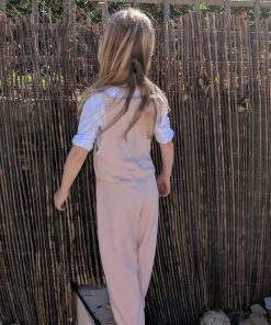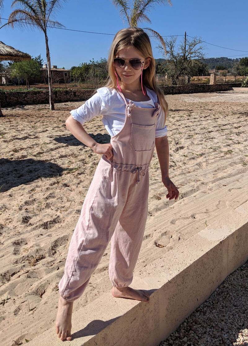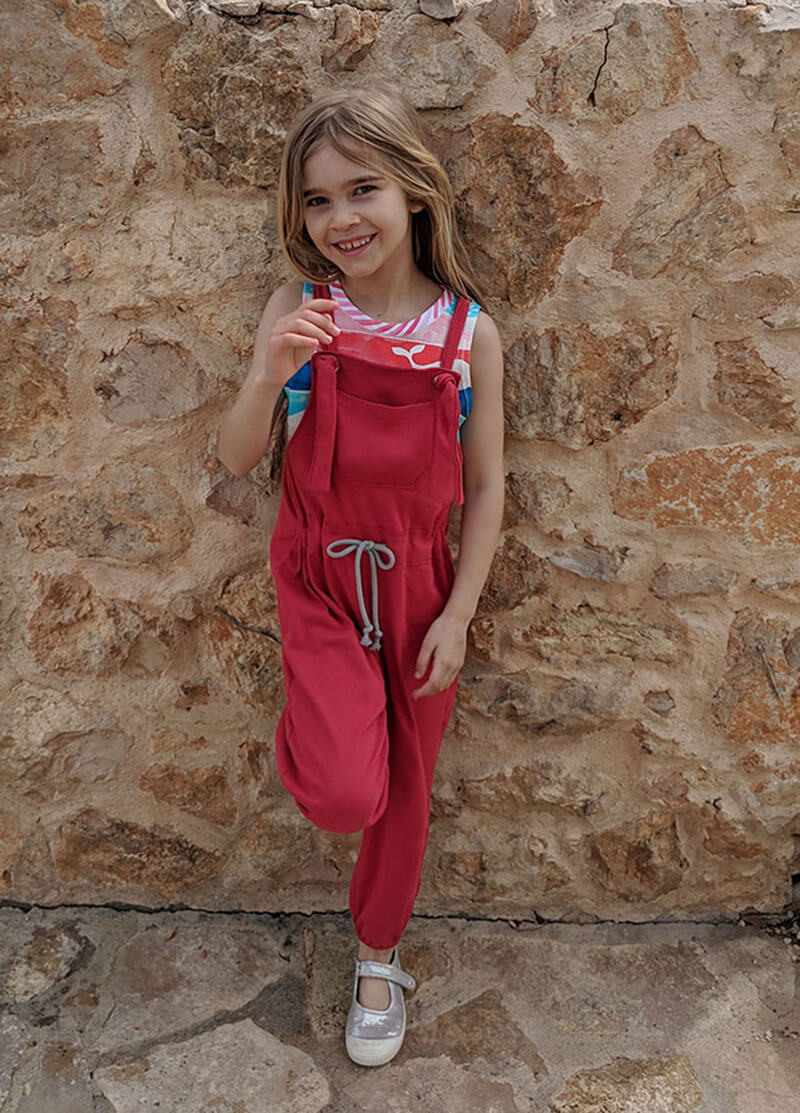 Dieser Jumpsuit ist ein ganz unkompliziertes Teil. Wichtig ist, dass die Stoffe dehnbar sind und weich fallen. Damit bekommst Du gleich einen ganz anderen Look. Das Besondere ist, dass am Oberteil, sprich am Latz eine größere Öse eingearbeitet wird. Durch diese wird dann der Träger durchgezogen, verknotet und ist damit befestigt. Aber wer da keine Lust drauf hat, der kann auch Druckknöpfe oder Knöpfe mit Knopflöcher anbringen. Der Jumpsuit ist so konzipiert, dass das Vorderteil eingehalten wird, das Rückenteil fällt gerade nach unten. Für die kühleren Jahreszeiten kannst Du Deinem Kind ganz einfach ein T-Shirt darunter kombinieren! Achtung bei den kleinen Größen: Der Anzug ist knöchellang geschnitten, wenn das bei Krabbelkinder nicht gewünscht ist dann einfach die Länge um ein paar Zentimeter am Hosenbein verlängern!