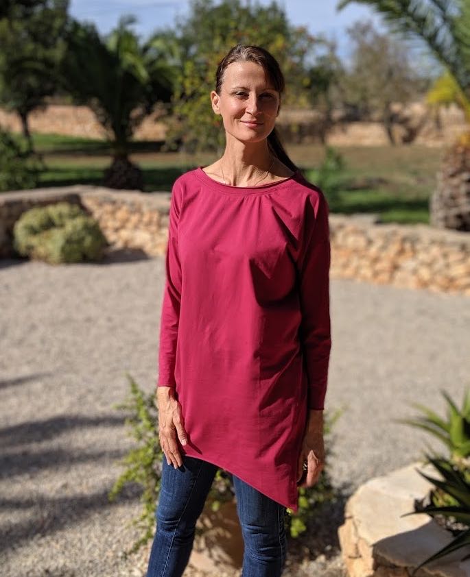 Materialempfehlung: Dehnbare, weiche Jerseystoffe. Zu dick oder zu fest sollte der Stoff nicht sein, es ist nämlich viel Weite enthalten und dann sieht die Silhouette nicht mehr so hübsch aus. Für die lange Version mit offenen Kanten am besten einen unifarbenen, durchgefärbten Jersey.