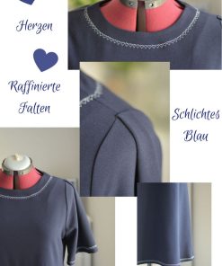 Ein einfaches Kleid mit vielen Optionen. Durch die schöne A-Linienform ist es auch für viele Figuren geeignet, da es an der Hüfte etwas weiter geschnitten ist und diese dann umschmeichelt….) Grundsätzlich kannst Du das Kleid aus allen Stoffen nähen. Sie sollten nur einen fließenden Fall haben, zu steife Stoffe eignen sich nicht. Für Anfänger empfehlen wir dehnbare Stoffe, da man das Kleid dann ohne Reißverschluss und Futter verarbeiten kann. Fortgeschrittene können stabile Stoffe verwenden, dann ist allerdings ein Reißverschluss notwendig. Ob mit oder ohne Futter ist vom Material abhänging. Im Ebook sind alle Varianten beschrieben. Die passenden VIdeos dazu gibt es auch von uns. Ihr könnt das Kleid auch mit langem Arm in langer Version nähen, im Ebook ist alles detailliert erklärt.
