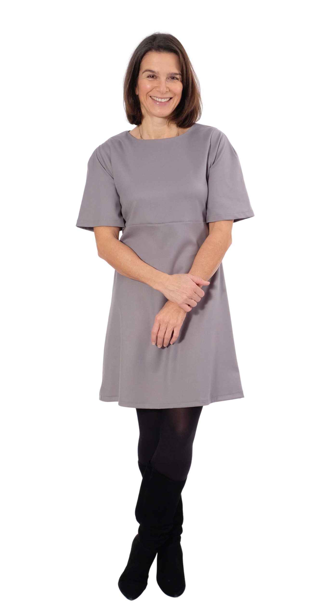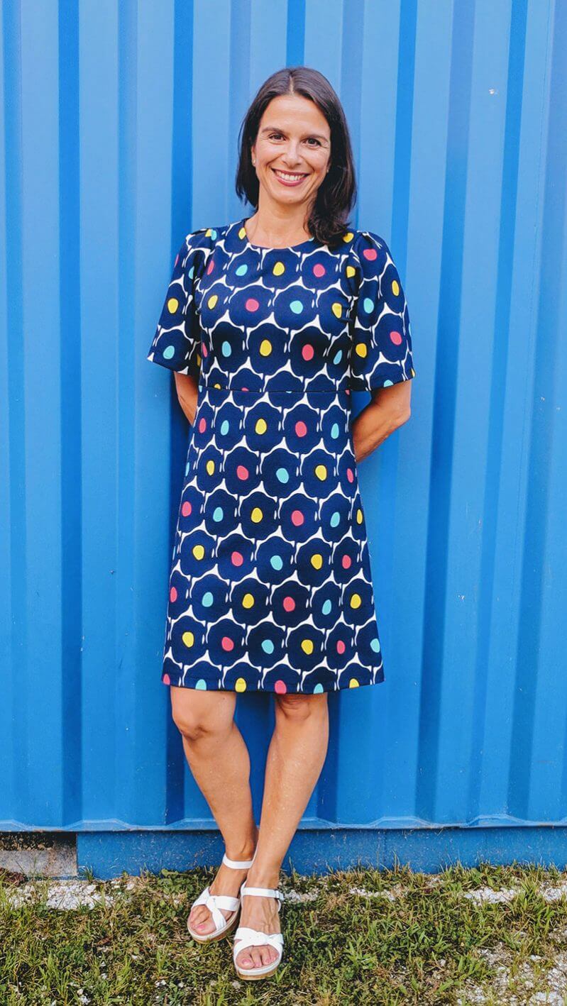 Ein einfaches Kleid mit vielen Optionen. Durch die schöne A-Linienform ist es auch für viele Figuren geeignet, da es an der Hüfte etwas weiter geschnitten ist und diese dann umschmeichelt….) Grundsätzlich kannst Du das Kleid aus allen Stoffen nähen. Sie sollten nur einen fließenden Fall haben, zu steife Stoffe eignen sich nicht. Für Anfänger empfehlen wir dehnbare Stoffe, da man das Kleid dann ohne Reißverschluss und Futter verarbeiten kann. Fortgeschrittene können stabile Stoffe verwenden, dann ist allerdings ein Reißverschluss notwendig. Ob mit oder ohne Futter ist vom Material abhänging. Im Ebook sind alle Varianten beschrieben. Die passenden VIdeos dazu gibt es auch von uns. Ihr könnt das Kleid auch mit langem Arm in langer Version nähen, im Ebook ist alles detailliert erklärt.