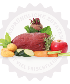 Fleisch und Innereien (61%) vom Rind sind der hochwertige Lieferant tierischen Proteins in unserem Nassfutter der Sorte Rind. Damit daraus eine ausgewogene Mahlzeit entsteht, garen wir es gemeinsam mit pflanzlichen Zutaten, unter anderem Kartoffeln, Karotten und Rucola. Neben Fleisch und Innereien vom Rind sind keine weiteren tierischen Bestandteile enthalten.