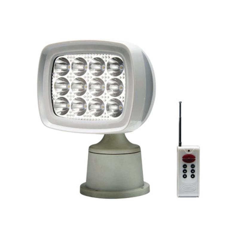Weißer Kunststoffsuchscheinwerfer, Wasserdicht nach IP67 für 10-30 Volt, mit Funkfernbedienung. Gehäuse aus PC, Sockel aus Nylon, mit 12 x 3 Watt Tageslicht weiß- LED-Lichter für ca. 50.000 Betriebsstunden. Lichtstrahlwinkel 125°, 1600 Lumen, 27 Watt. Aus einer Entfernung bis 50 Meter per Funk 355° drehbar und 75° vertikal schwenkbar. Anschlusskabel 4 Meter.