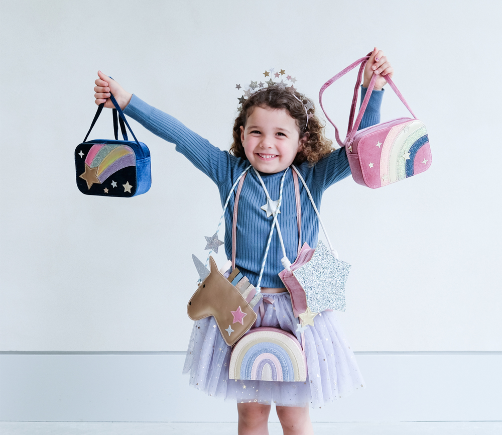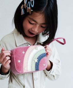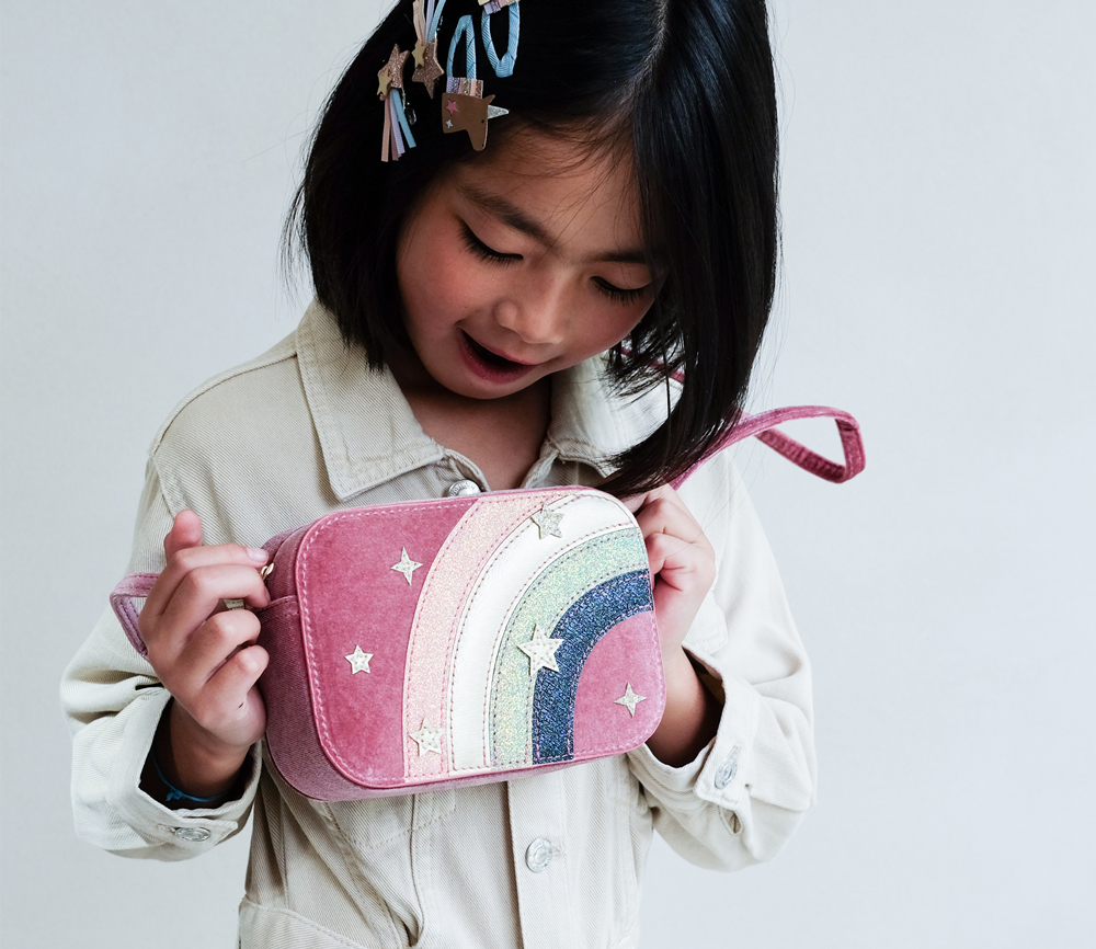 Mimi & Lula Kindertasche OVER THE RAINBOW. Diese niedliche Umhängetasche bietet Platz, um kleine Schätze, Kleingeld oder einen Schlüssel zu verstauen. Der Samtlook mit dem Regenbogen aus matten Metallic- und Glitzerstoffen und den goldenen Sternen ist ein echter Blickfang. Diese süße Tasche mit Reißverschluss ist ideal für den Alltag und perfekt für Partys!