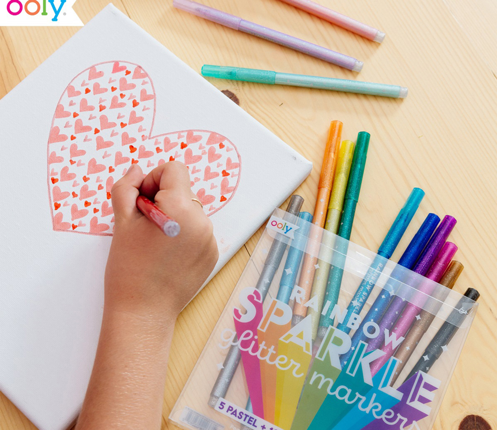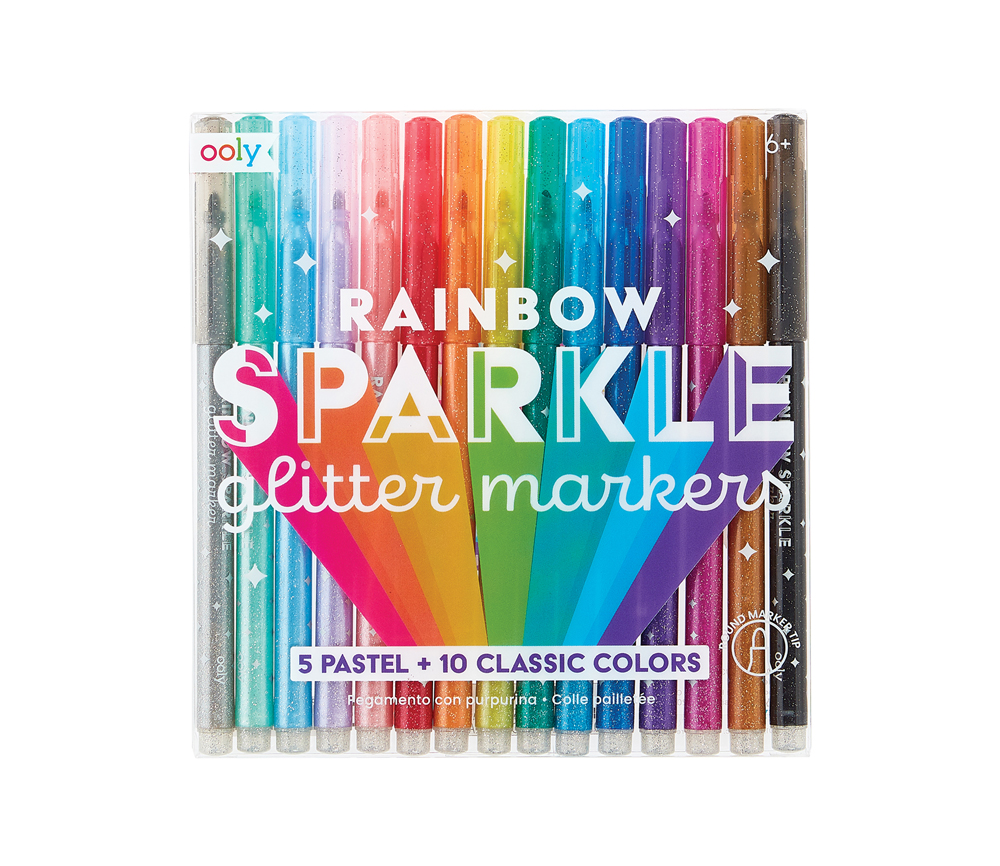 15 Regenbogen Glitzer Marker von OOLY für coole, kreative, kunterbunte kleine Kunstwerke. Das Set besteht aus 10 klassischen Regenbogenfarben und 5 Pastellfarben und alle glitzern schön. Mit diesen Stiften malen Kinder besonders gern. Geeignet sind die Marker für Kids ab 4 Jahre.