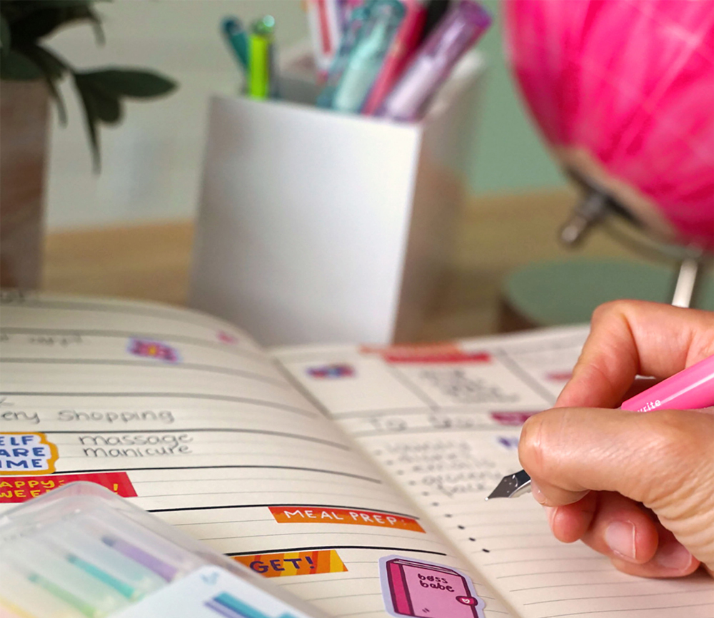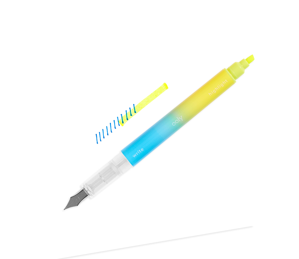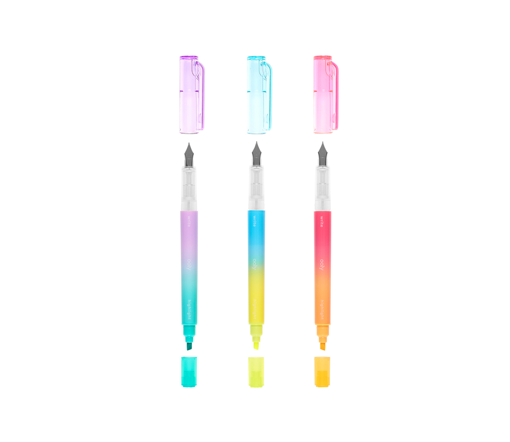 Writer’s Duos ist ein Set aus drei Füllfederhaltern mit farbiger Tinte, die in wunderschönem Blau, Rosa und Lila schreiben. Wenn Sie den Stift umdrehen, erscheinen die Textmarker mit Keilspitze in Pastellfarben wie Gelb, Blaugrün und Orange.