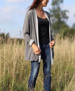 Diese Jacke kannst Du auf verschiedene Arten nähen, ein Schnitt mit vielen Verarbeitungsmöglichkeiten. Im Ebook erklären wir alle Varianten Schritt für Schritt. Ob klassisch oder im “Used Look”, das Modell wirst Du sicher einige Male nähen. Die Jacke ist aber nicht nur optisch ein Highlight, auch das Nähen geht sehr schnell und einfach und ist auch für Nähanfängerinnen gut machbar. Wichtig ist die Stoffauswahl, da die linke Warenseite durch den “Schalkragen” sichtbar wird. Je leichter und schöner die Ware fällt, desto hübscher finden wir die Jacke. Dicke, schwere Stoffe eignen sich hier nicht. Die Jacke kann optional mit seitlichen Eingriffstaschen genäht werden.
