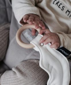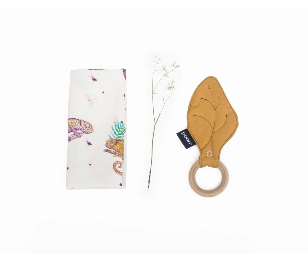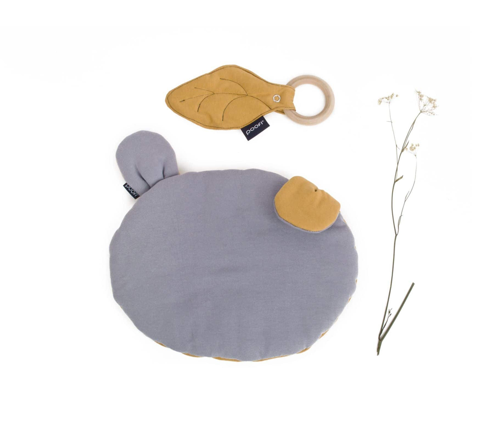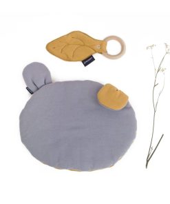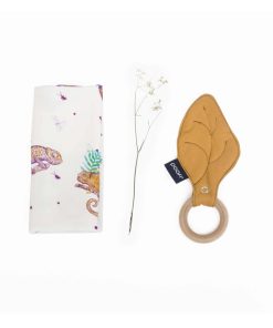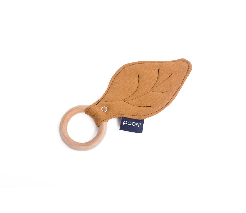 Der Beißring besteht aus 100% massivem, weichem und unbehandeltem Ahornholz. Das Blatt selbst besteht aus weicher Bio-Baumwolle. Die spezielle Einlage macht das Blatt leicht flauschig und noch angenehmer anzufassen.