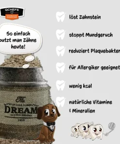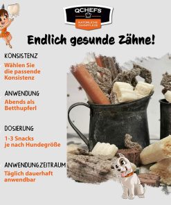 Mund gesund = Hund gesund! Die natürlich antibakterielle Wirkung reduziert die Plaquebakterien im Mund. QCHEFS Käse muss sich nur gut im Maul verteilen und kann so effektiv gegen Mundgeruch und Zahnstein wirken! Tägliche Zahnpflege ist die Basis für ein gesundes Hundeleben.