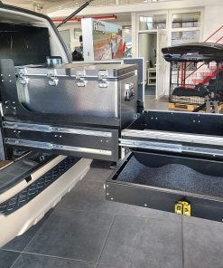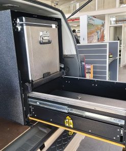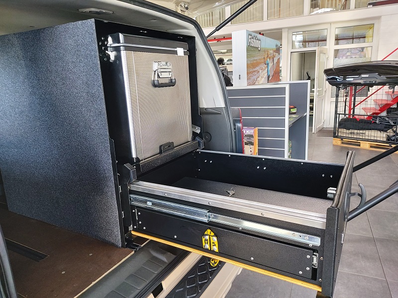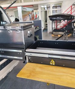 Die Schublade wird herausgezogen und in einem Schritt fährt die Kühlbox nach unten. Dies ermöglicht einen einfachen Zugang zu Ihrer Kühlbox in erreichbarer Höhe. Das extrem Praktische der Miniküche ist, dass Sie die Schublade und den Kühlschrank gleichzeitig benutzen können. Gefertigt aus 2 mm, bzw. 3 mm Aluminium und 3 mm Edelstahl und ist in höchster Qualität pulverbeschichtet.