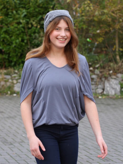 Wir lieben dieses Teil, weil es so vielseitig kombiniert werden kann. Ob es sportlich oder chic kombiniert wird, es ist ein idealer Begleiter für unterwegs. Das Teil sollte aus weichen und dünneren Qualitäten genäht werden, daher ist es für Anfänger nicht unbedingt zu empfehlen. Die Schwierigkeit liegt hier eher in der Verarbeitung des Materials. Wir haben hier einen dünneren Strickstoff, Viskosejersey als auch Modaljersey verwendet.