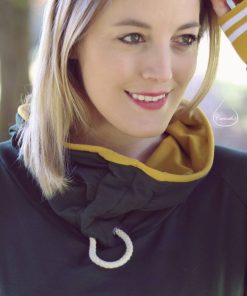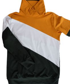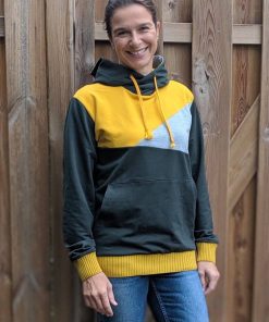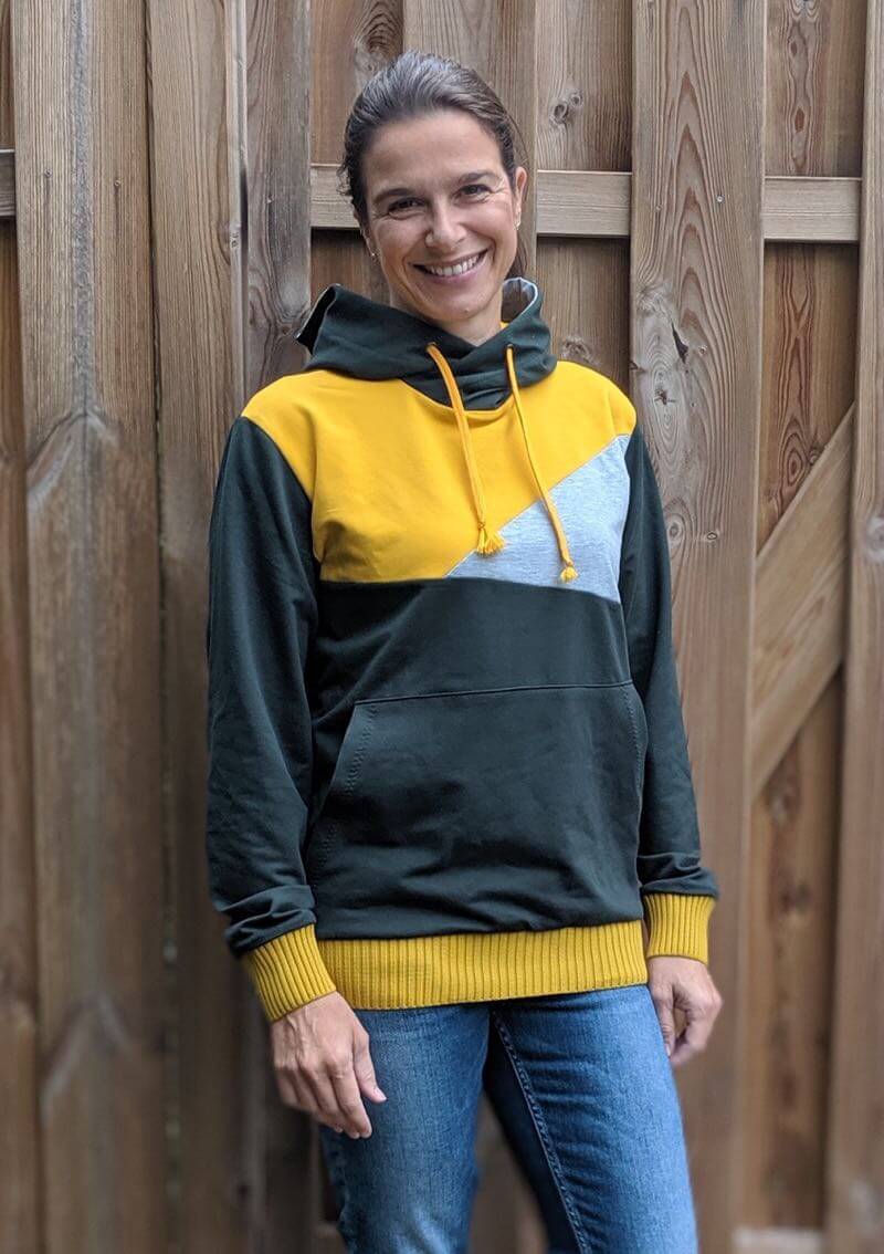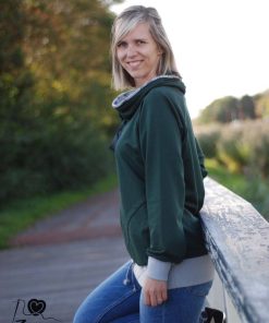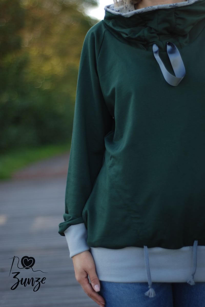 Ein hochwertiger French Terry Stoff aus Baumwolle/Elasthan in Grün. Sweatshirts, Kleider, Shirts, Hosen, Mützen und vieles mehr lassen sich hier wunderbar daraus nähen. Die Innenseite hat die typische Schlangenoptik. Sehr hübsch sieht hier die Farbe Weiß und Curry dazu aus. Abbildung Schnittmuster Jamika, Shirt Maren und Hoodie David.