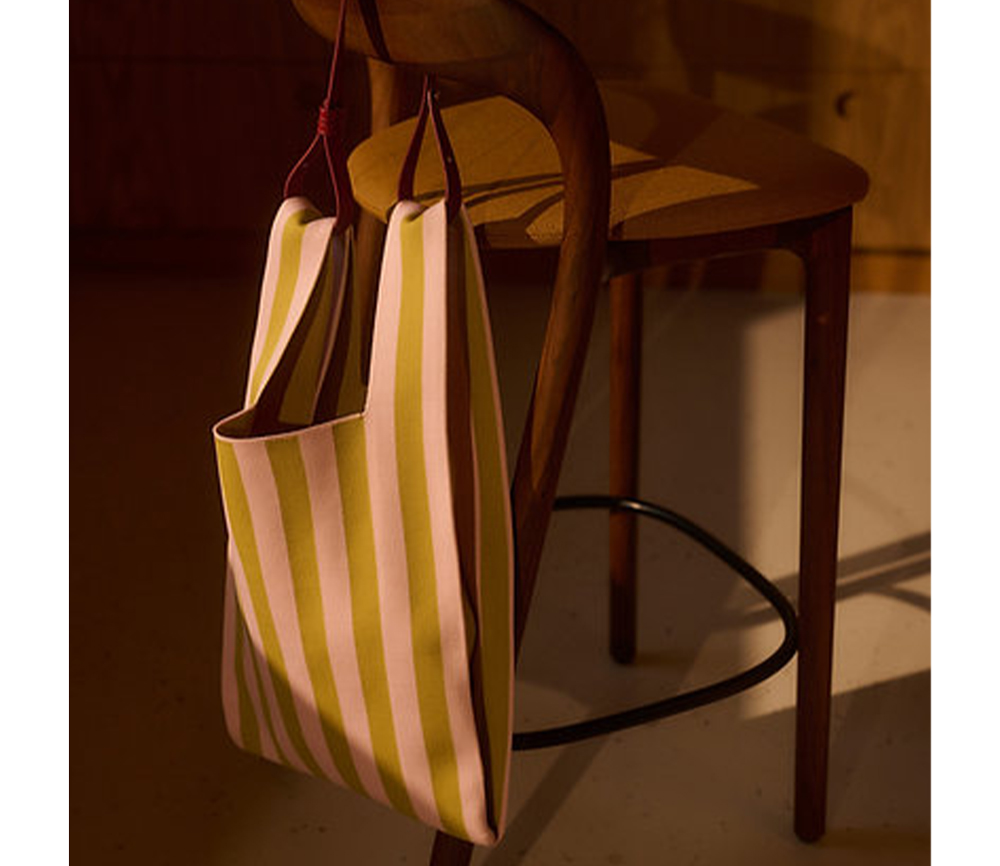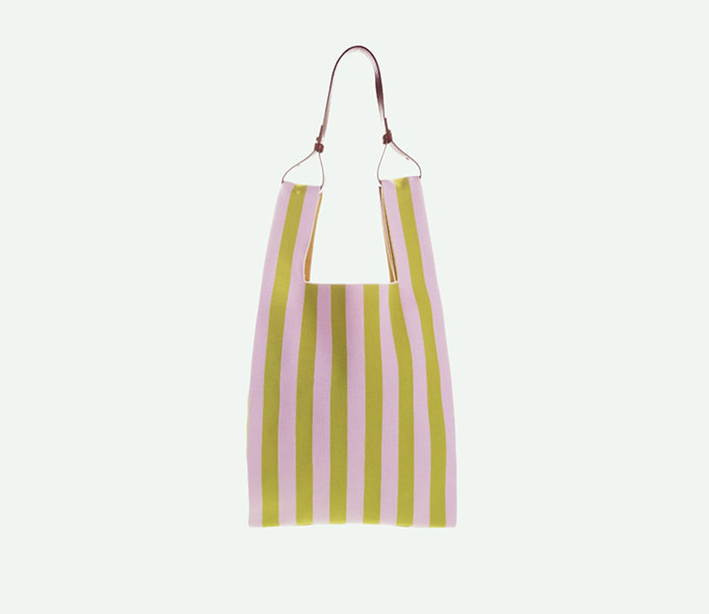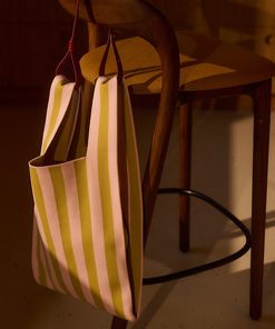 Wunderschöne gestrickte Einkaufstaschen mit Streifen. Diese Taschen sind gestrickt und fühlen sich so weich und edel an. Die Details aus veganem Leder machen die Taschen zu etwas ganz Besonderem. Sie können den Griff einfach abnehmen, sodass Sie die Tasche auf verschiedene Arten tragen können.