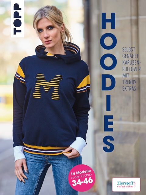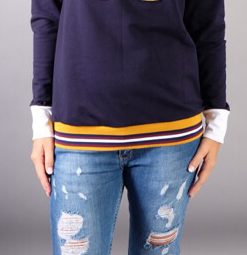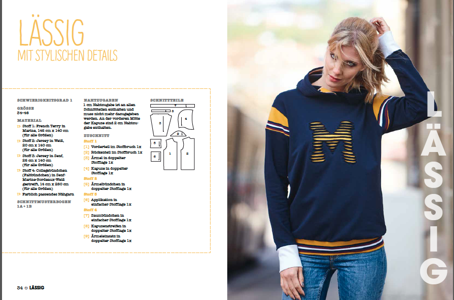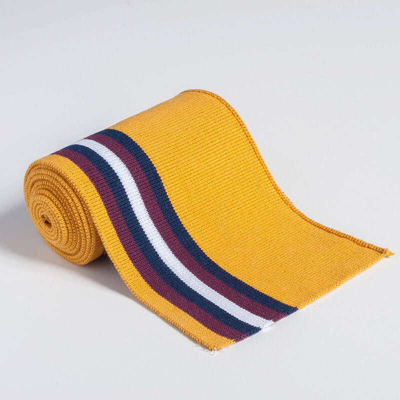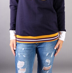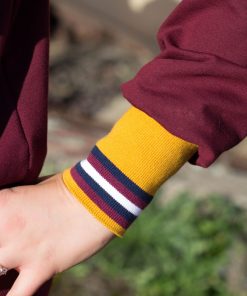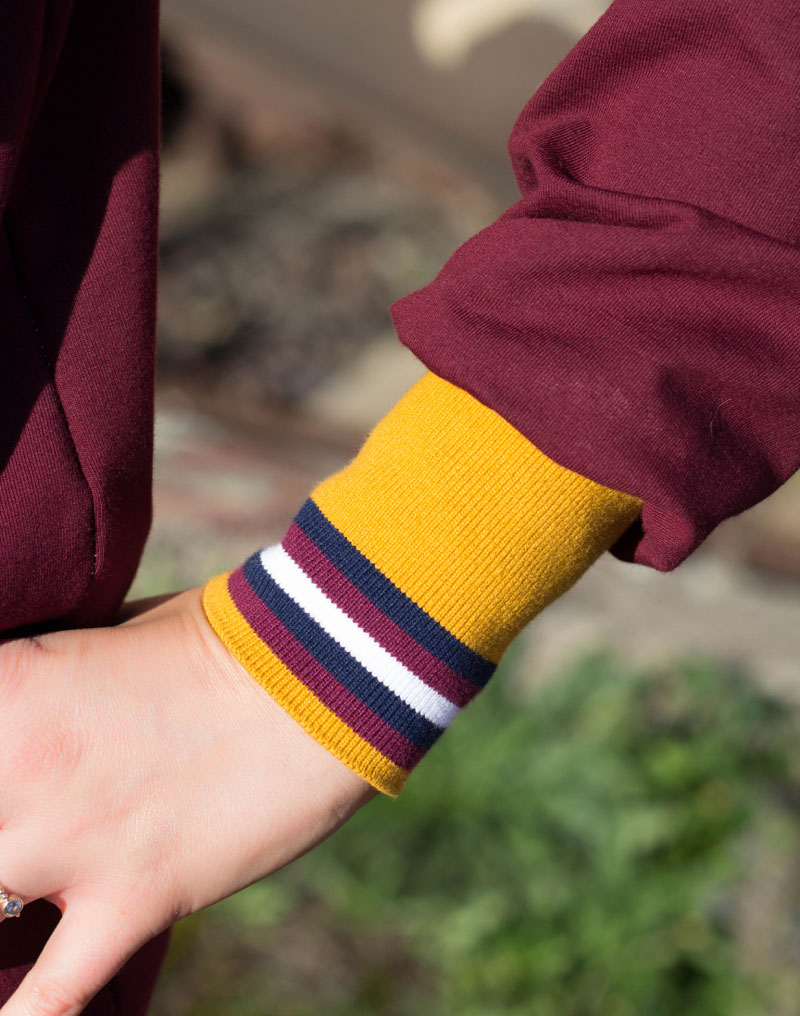 Dieses tolle Bündchen, Strick-Bündchen im Collegestyle mit Streifen in Marine, Bordeaux und Weiß ist ein Must-have für unzählige neue Designmöglichkeiten und grenzenlose Kreativität. Es wird in einfacher Stofflage angenäht und die Breite kann dabei selbst bestimmt werden. Der Bündchenstoff eignet sich hervorragend für Abschlüssen an (College-)jacken, Hosen, Shirts & Pullovern. Abbildung Pullover aus unserem Buch “Hoodies”.
