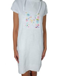 Ein einfaches, aber schönes Kleid mit einer kreativen Taschenlösung. Die Stoffkanten an der Kapuze und an der Tasche werden offen verarbeitet. Wir haben bei dem weißen Kleid eine negativ Applikation eingearbeitet, diese kannst Du kostenlos bei uns im Shop herunterladen. Den Einsatz am Vorderteil kannst Du einarbeiten oder auch weglassen, somit ist dieses Schnittmuster auch für Nähanfängerinnen geeignet. Durch die Auswahl des Stoffes und verschiedener Bänder oder Applikationen wird es immer wieder anders aussehen. Beim dem Kinderkleid haben wir eine Applikation aufgenäht.