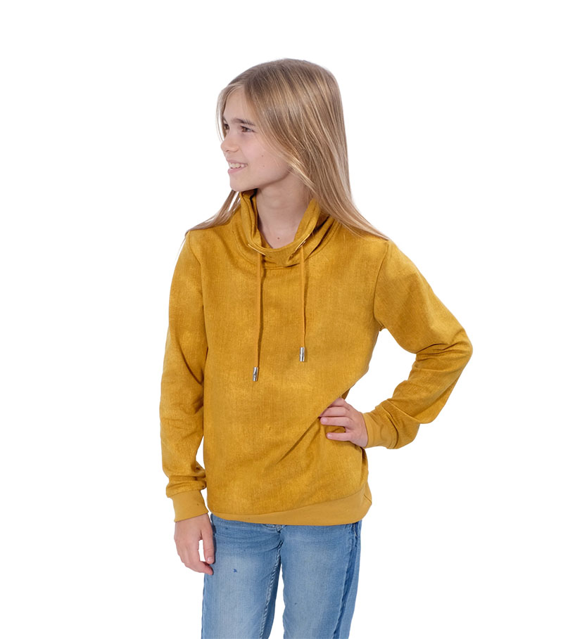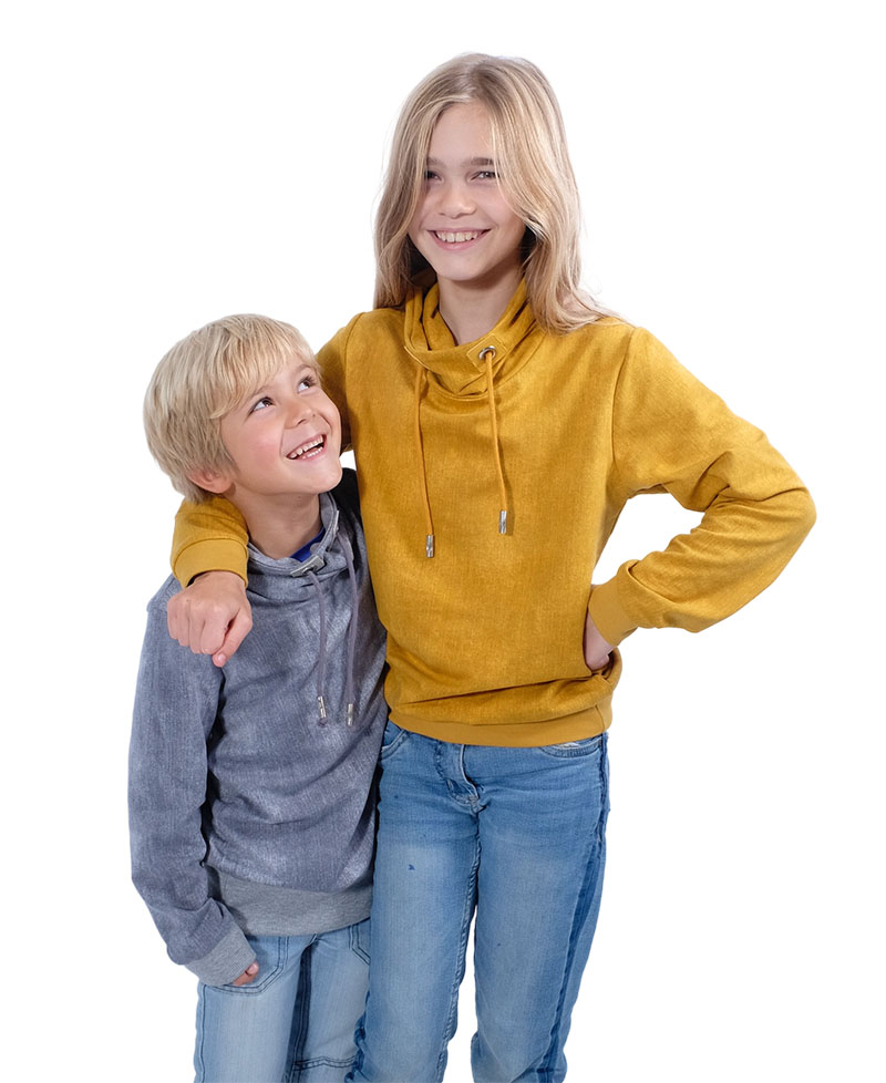 Eine wunderschöne “Sommersweat” Sweatshirt Qualität mit gebatikter Optik. Ideal für Mützen, Schals, Oberteile, Jacken, Kleider, Röcke und vieles mehr. Die Rückseite ist nicht angeraut sondern weißt die typische Schlingenstruktur auf. Abbildung Schnittmuster Kindershirt Bobby.