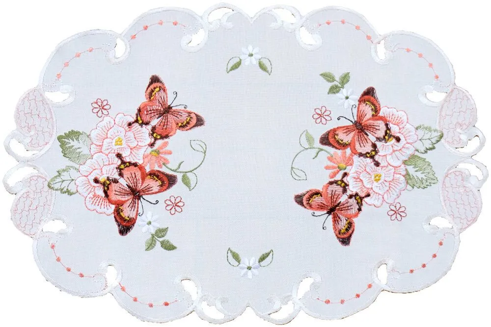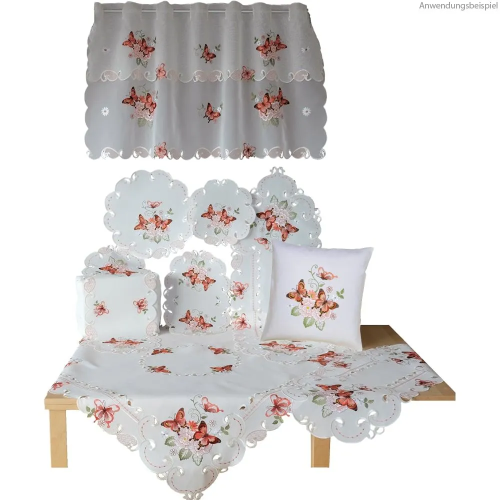 - Mitteldecke / Tischdecke mit buntem Frühlingsmotiv – gestickte Schmetterlinge in weiß & gelb & rot