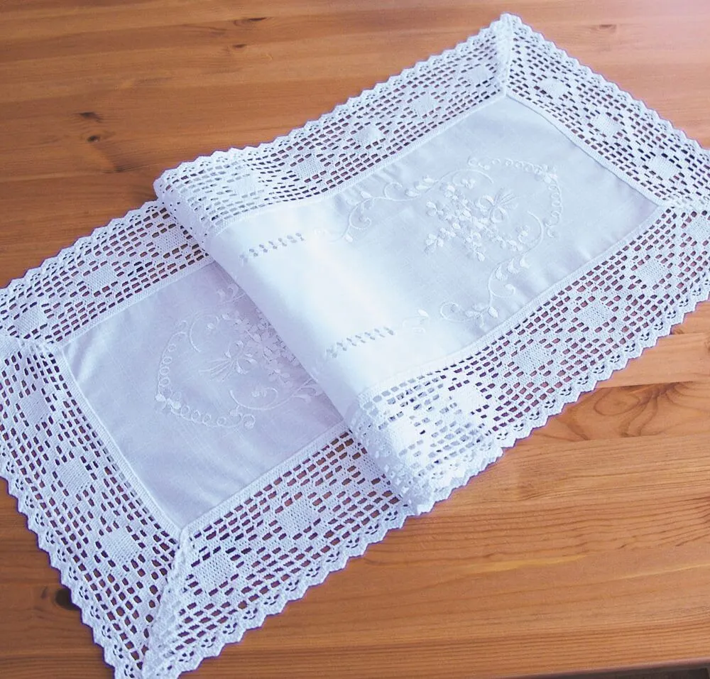 - Tischläufer / Mitteldecke weiß im Landhausstil mit edler Stickerei & Häkelkante / Häkelspitze