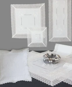 - Tischläufer / Mitteldecke – mit Hohlsaum, edler Stickerei & feiner Spitze – im Landhausstil