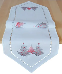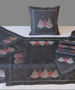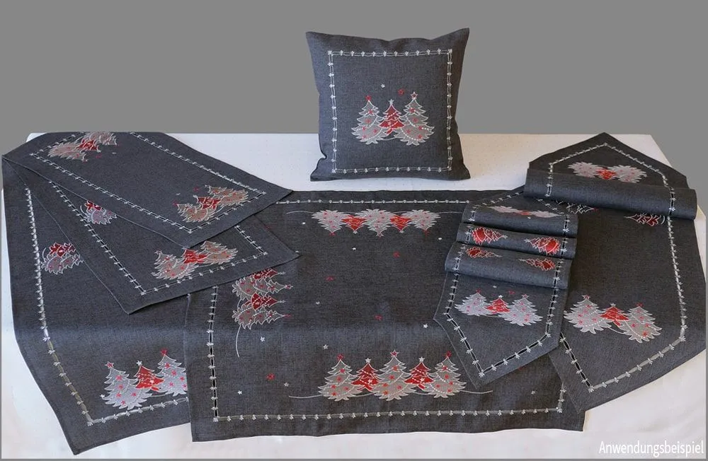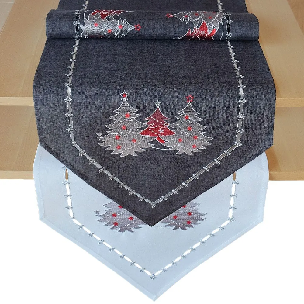 - Tischläufer / Mitteldecken spitz zulaufend in dunkelgrau & weiß mit gestickten Weihnachtsbäumen – optimal für Weihnachten