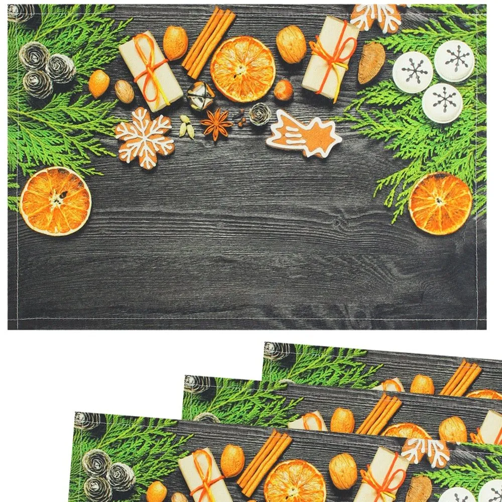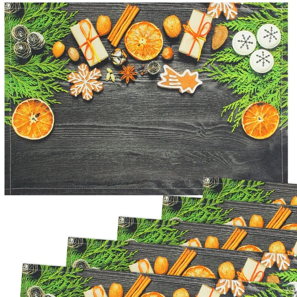 - Schöne Tischsets aus gewebtem Stoff mit schöner Weihnachtsdeko, Geschenken und leckeren Gewürzen auf dunklem Holz bedruckt