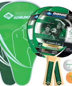 Das tolle Tischtennis-Set»Champs 400 Cover Set« von DONIC SCHILDKRÖT besteht aus zwei hochwertigen »Champs 400«-Schlägern, die sich ideal für den Schulsport und die Freizeit eignen. Sie besitzen einen Jade ITTF-Belag mit 1,5-mm-Schwamm sowie einen konkaven Holzgriff, der gut in der Hand liegt. Im Set enthalten sind außerdem zwei Schlägerhüllen mit Reißverschluss sowie vier 1-Stern Elite Poly 40+-Bälle (zwei weiße und zwei gelbe).