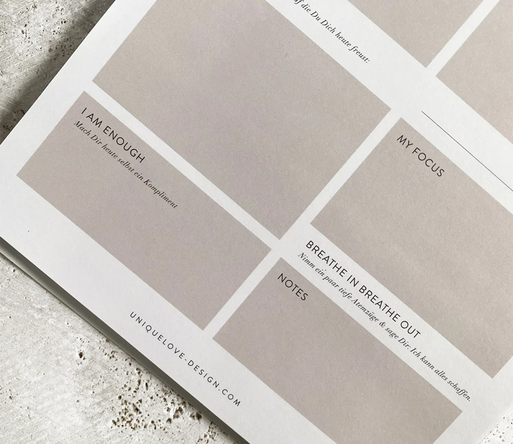 So findest Du im Kalender Platz für Deine Familie, aber auch für Deine Arbeit als Working Mom, ebenso für Deine Me-Time und Deinen persönlichen Focus am Tag. Ganz bewusst haben wir auch Felder integriert, die nichts mit To Do‘s zu tun haben. So mache Dir jeden Tag auch selbst ein Kompliment oder halte fest, auf was Du Dich besonders freust an diesem Tag.