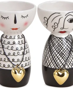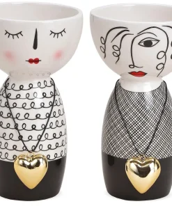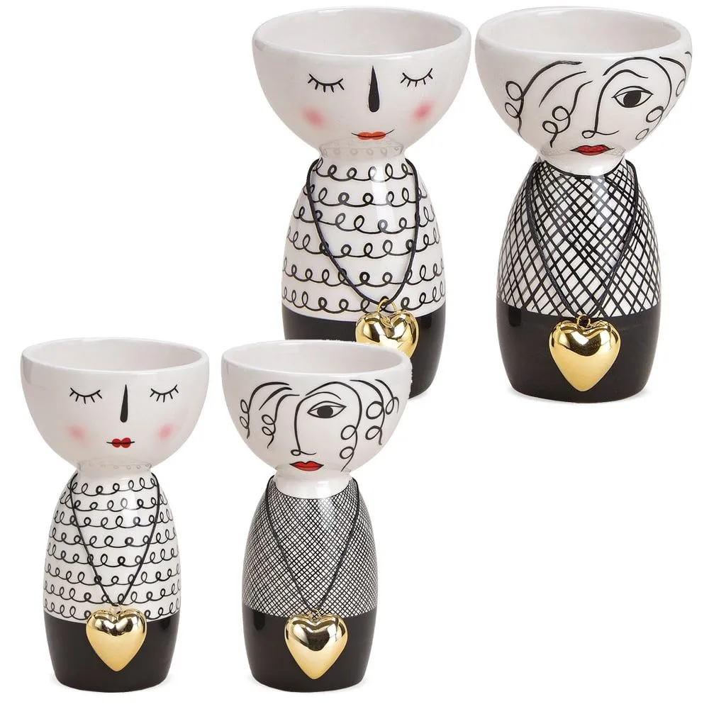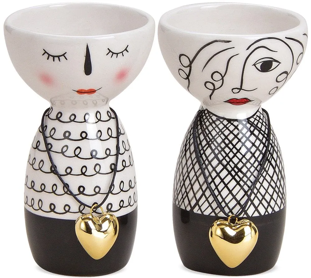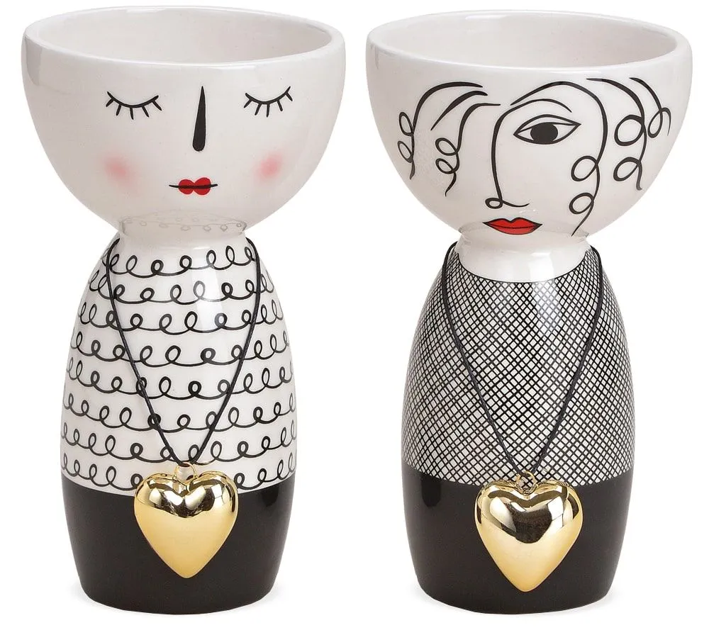 - Moderne Blumenvasen / Vasen mit Gesichtern und goldenem Herzanhänger. Auffälliges schwarz-weiß Design