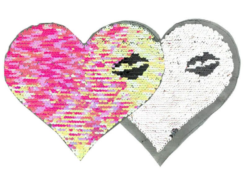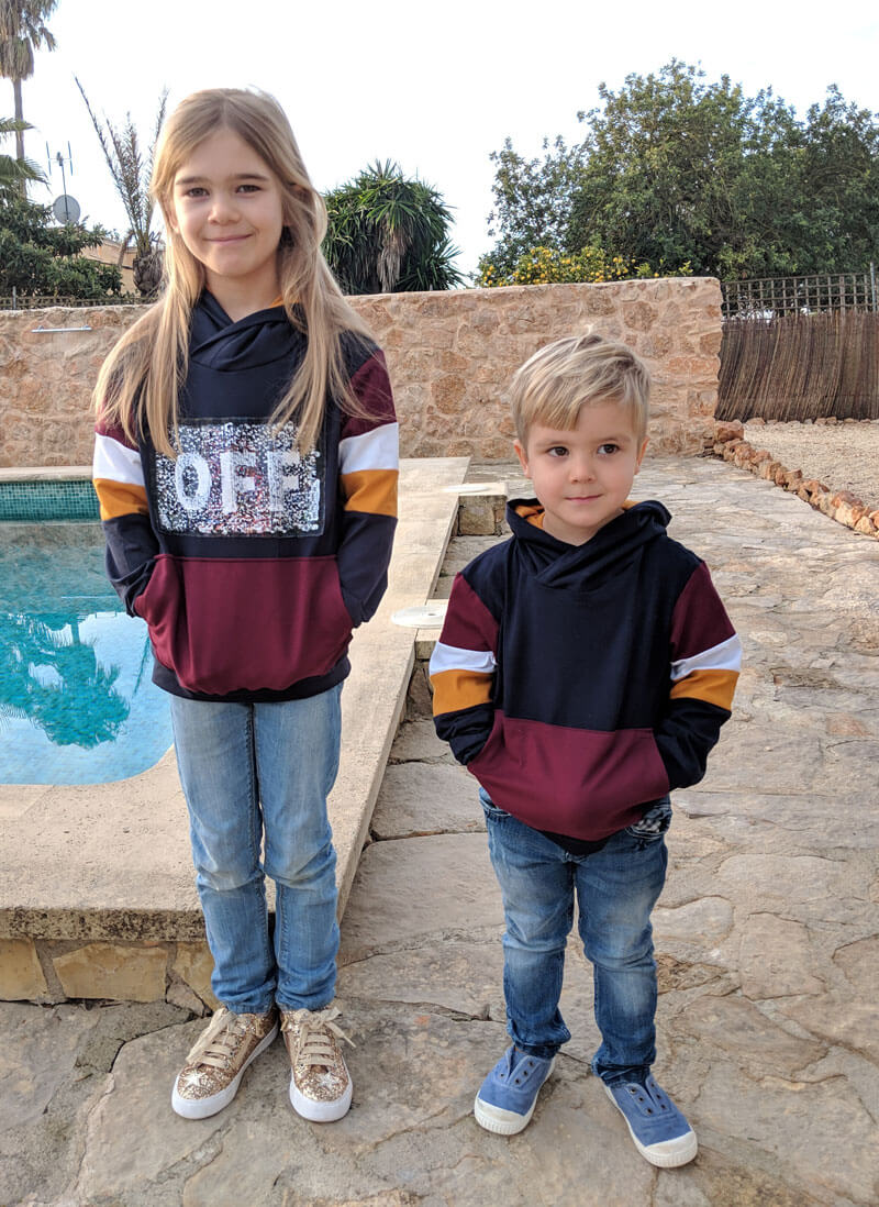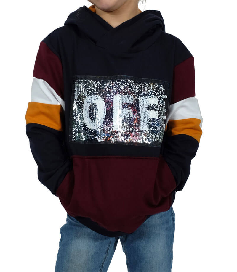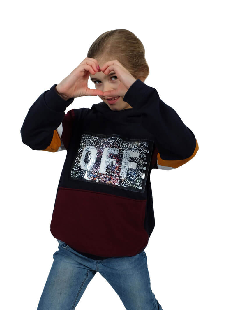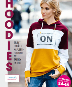 Wendepailletten, Pailletten, Aufnähbilder sind aktuell ein großes Trendthema und sehr angesagt. Die Applikation muss aufgenäht werden. Abbildung Schnittmuster Hoodie Jean und der Titelpullover aus unserem Nähbuch “Hoodies” mit einer anderen Applikation zur Inspiration.