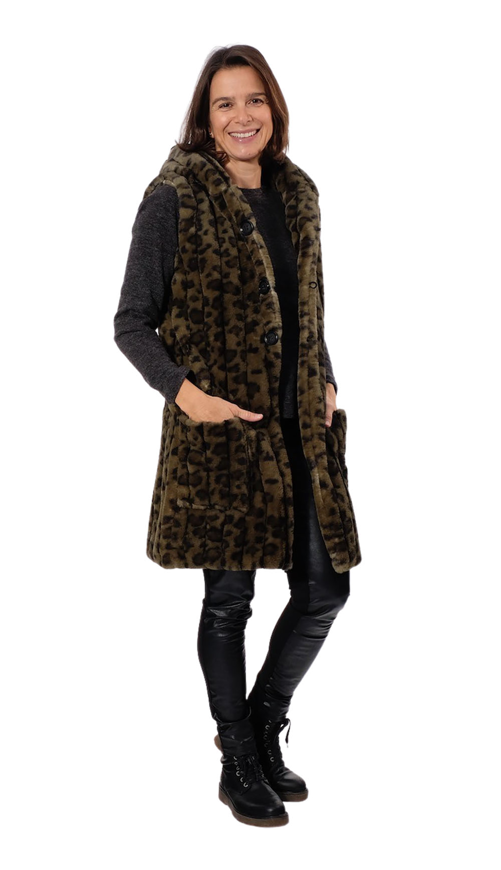 Diese tolle Weste ist ein super Begleiter für die kühleren Temperaturen. Ob mit oder ohne Futter, aus Wollstoffen oder aus Steppern, sie ist auch Dank der raffiniert geschnittenen Kapuze immer ein Hingucker. (Eine ähnliche Weste mit Kragen heißt Berinda und gibt es hier.) Das Stoffpaket für den grünen Fake Fur Leo Stoff gibt es hier.